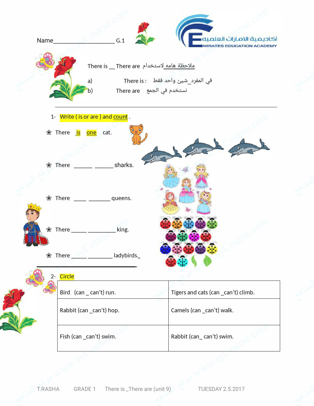 معلومات الملف: الصف الأول, الفصل الثالث, لغة انكليزية, أوراق عمل there is-there are- can-can't.