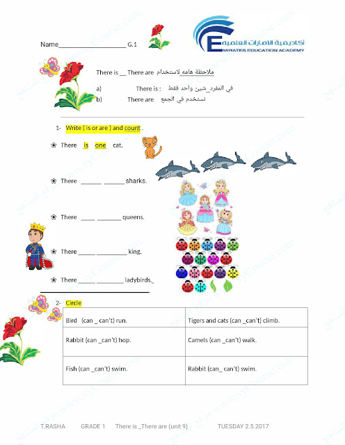 الصف الأول, الفصل الثالث, لغة انكليزية, أوراق عمل there is-there are- can-can't