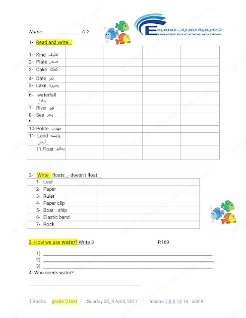 الصف الثاني, الفصل الثالث, لغة انكليزية, نموذج امتحاني | ||