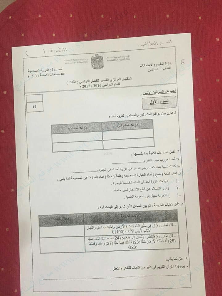 الصف السادس, الفصل الثالث, تربية اسلامية, اسئلة الاختبار المركزي القصير 2017