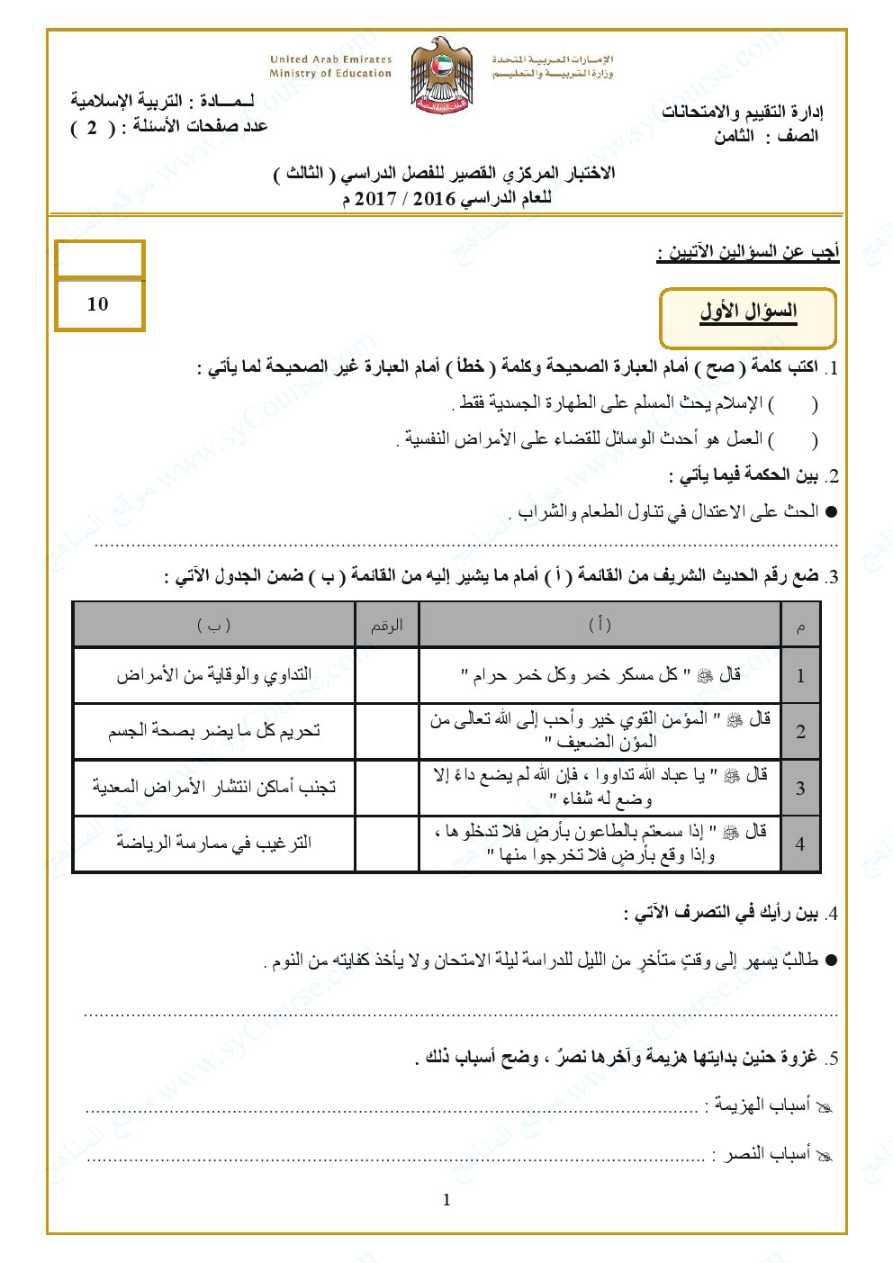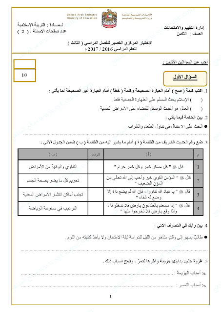 معلومات الملف: الصف الثامن, الفصل الثالث, تربية اسلامية, اسئلة الاختبار المركزي القصير . | ||