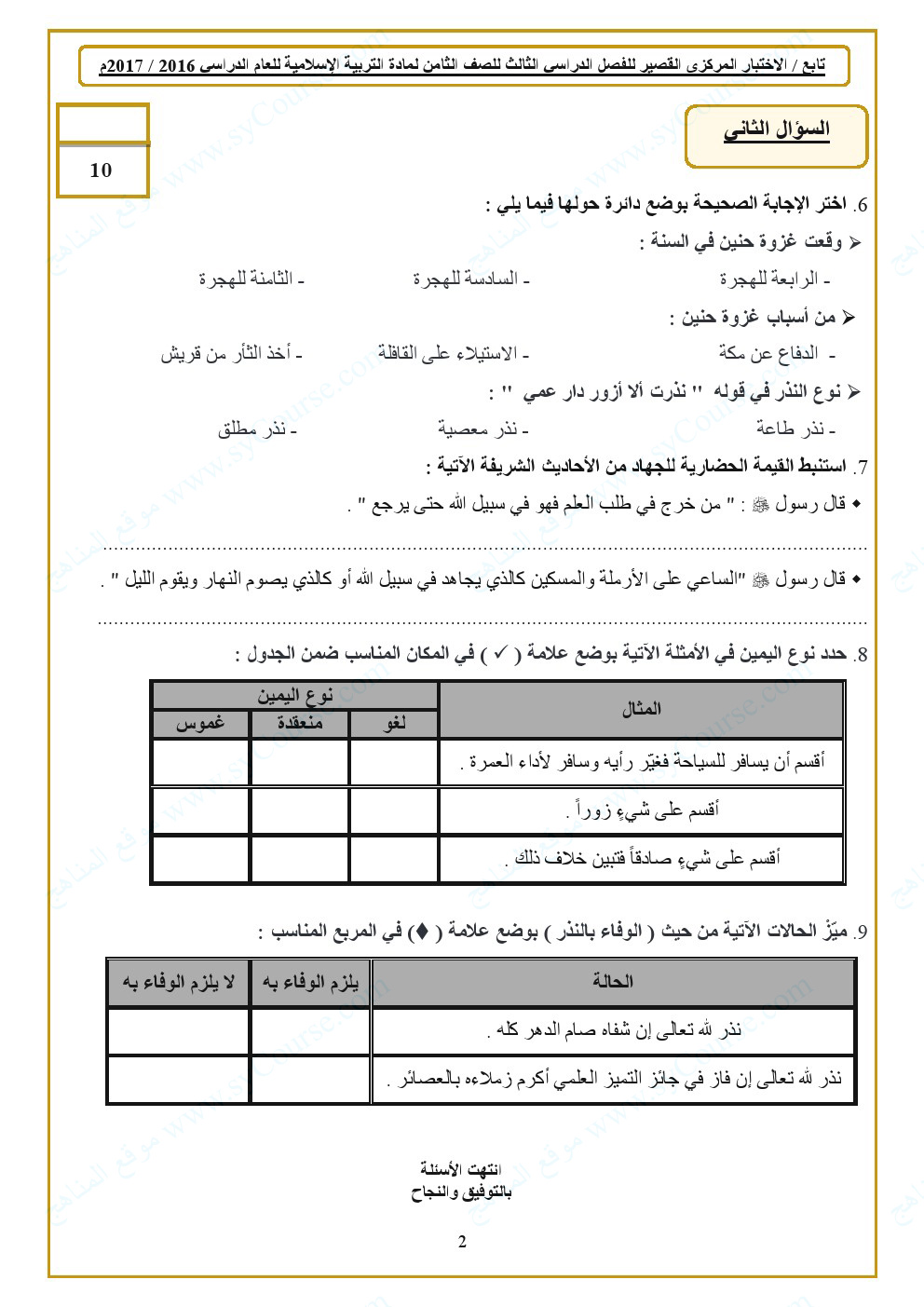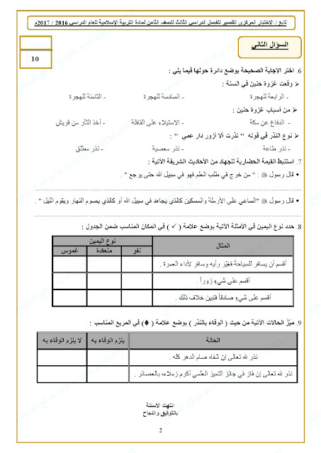 الصف الثامن, الفصل الثالث, تربية اسلامية, اسئلة الاختبار المركزي القصير |