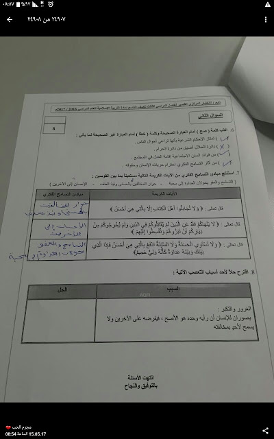 الصف التاسع, الفصل الثالث, تربية اسلامية, اسئلة الاختبار المركزي القصير | ||
