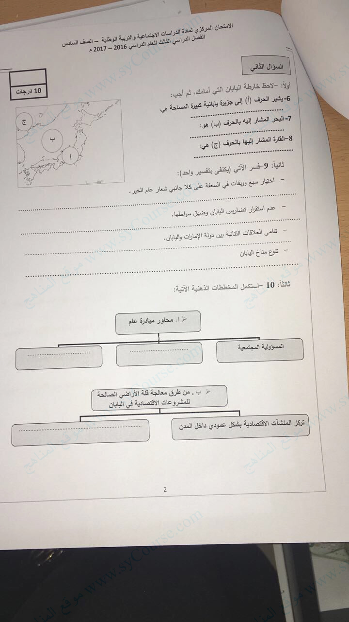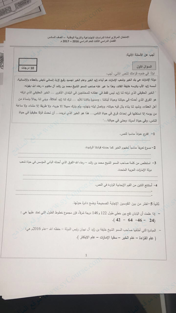| الصف السادس, الفصل الثالث, اجتماعيات, أسئلة الاختبار المركزي القصير 2017 | ||