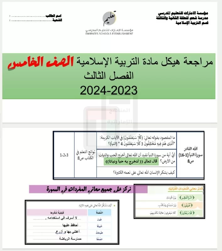 معلومات الملف: نرفق لكم ملف يتضمن أسئلة مراجعة امتحانية وفق الهيكل الوزاري من مادة التربية الاسلامية للصف الخامس الفصل الدراسي الثالث للعام الدراسي 2023-2024 | ||