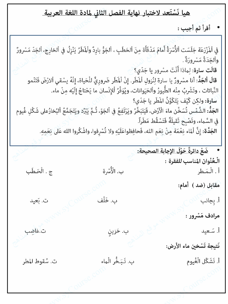 الصف الثاني, لغة عربية, نموذج لامتحان نهاية العام |