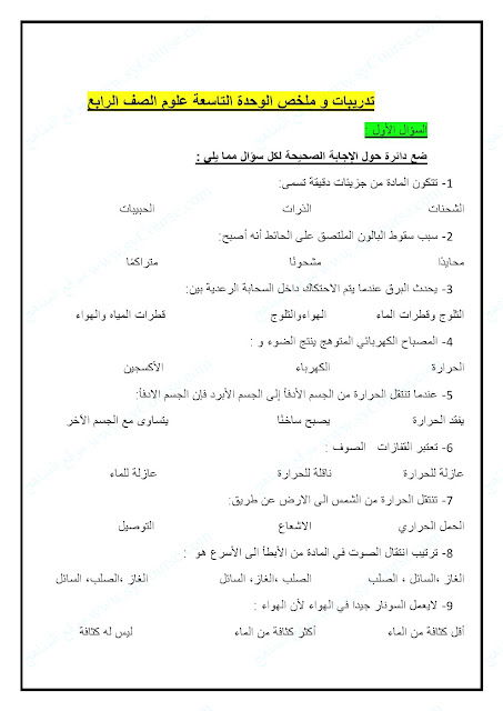الصف الرابع, الفصل الثالث, علوم, تدريبات وملخص الوحدة التاسعة | ||