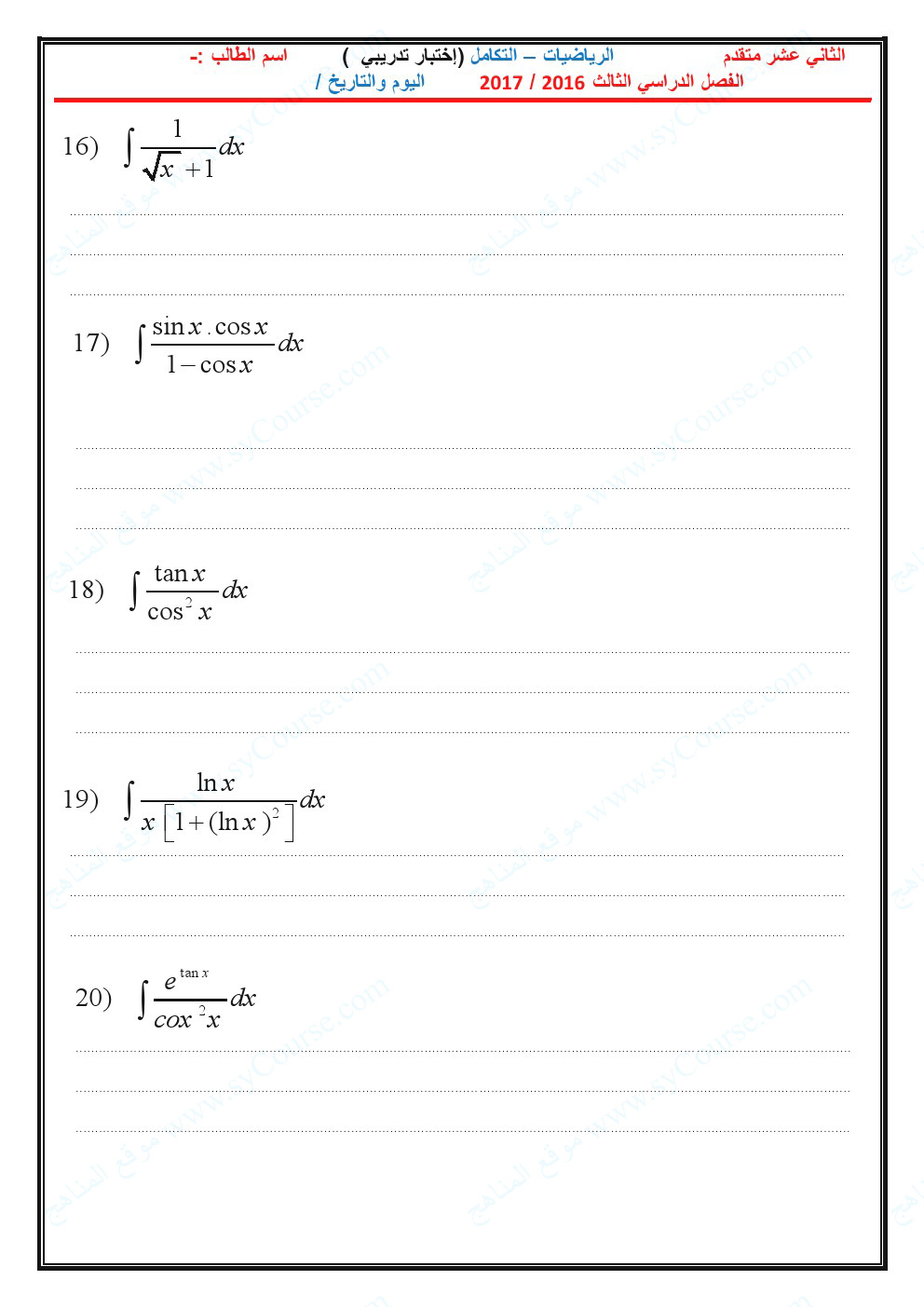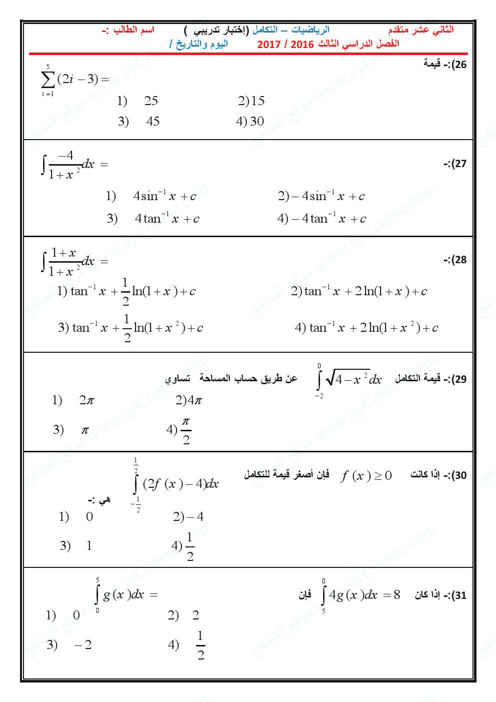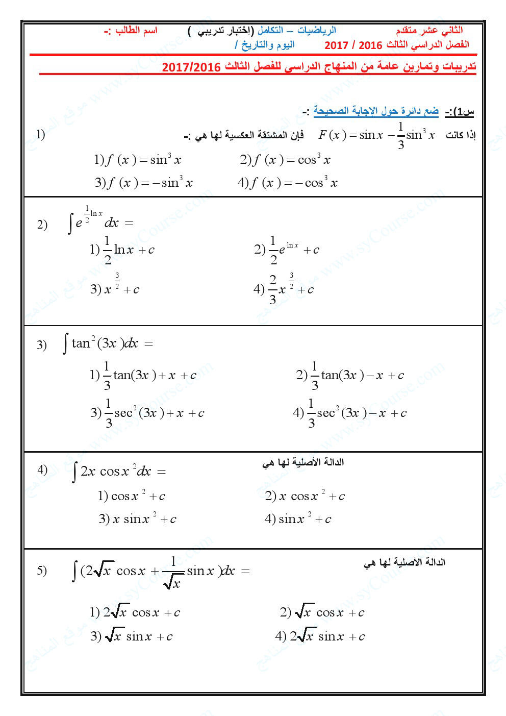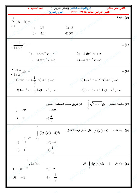 معلومات الملف: الصف الثاني عشر المتقدم, الفصل الثالث, رياضيات, إختبار تدريبي في التكامل | ||