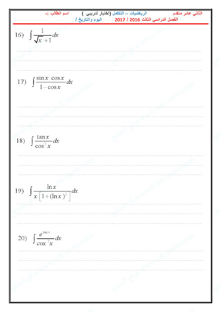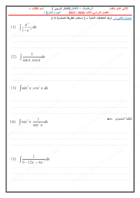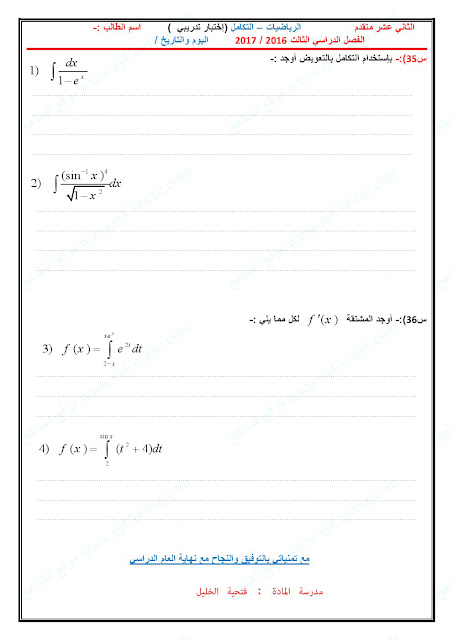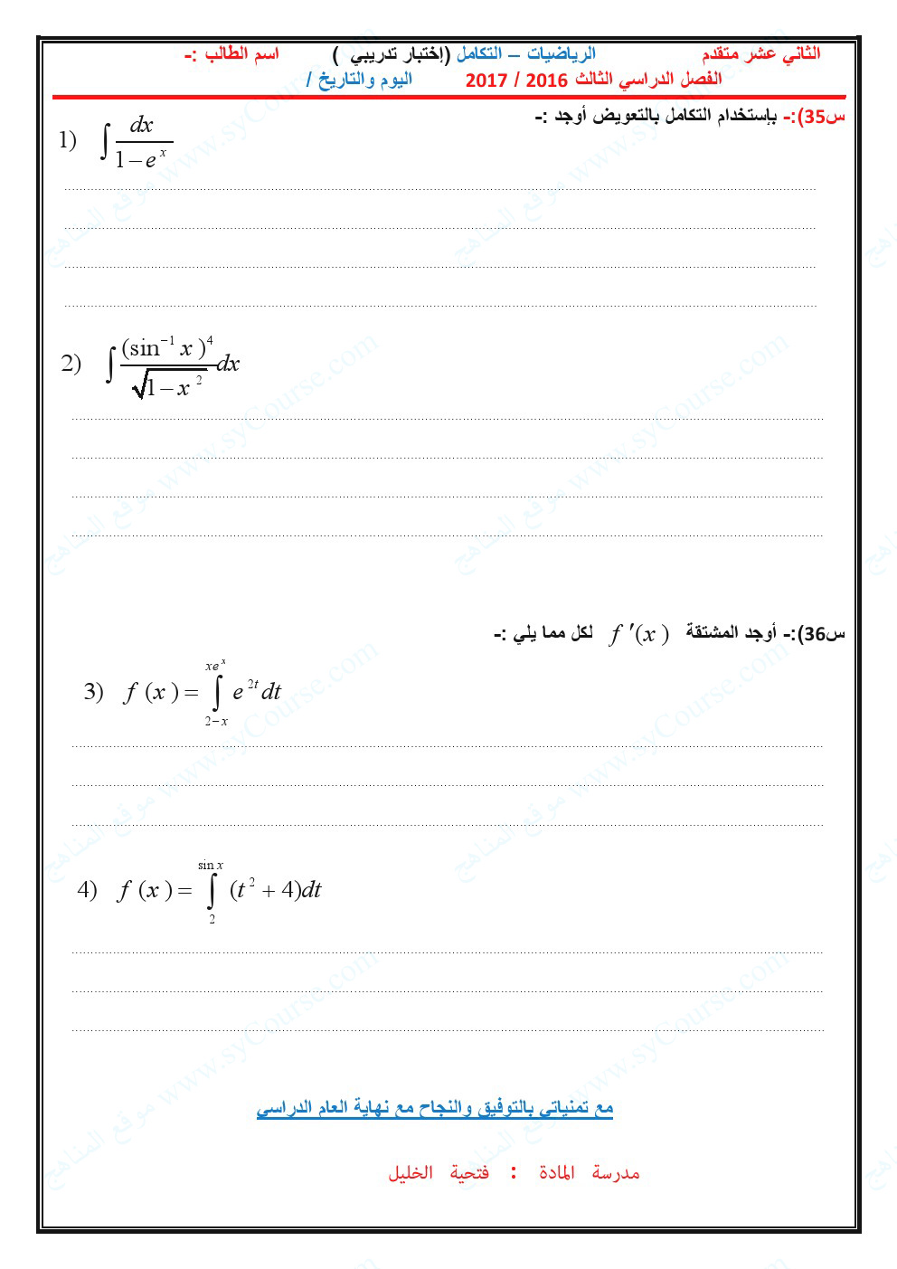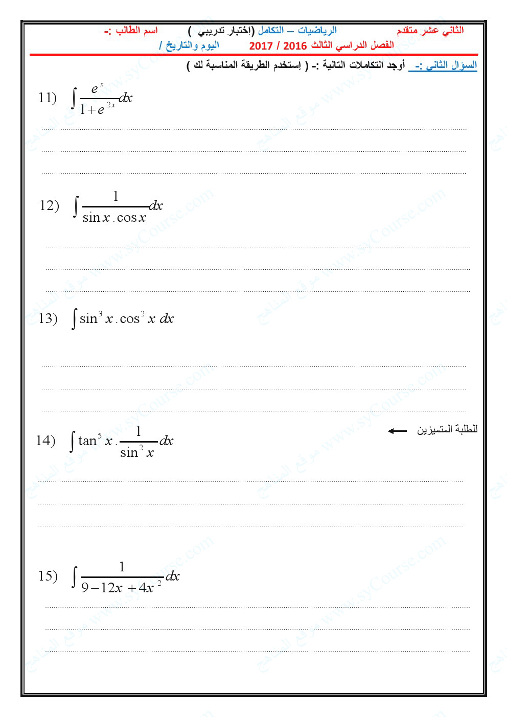 معلومات الملف: الصف الثاني عشر المتقدم, الفصل الثالث, رياضيات, إختبار تدريبي في التكامل | ||