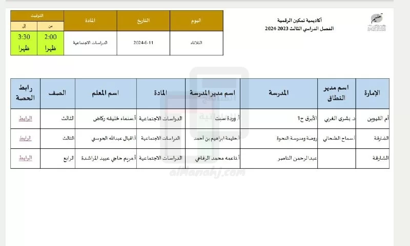تم إيجاد الملف: جدول حصص يوم الثلاثاء من أكاديمية تمكين الرقمية لجميع الصفوف