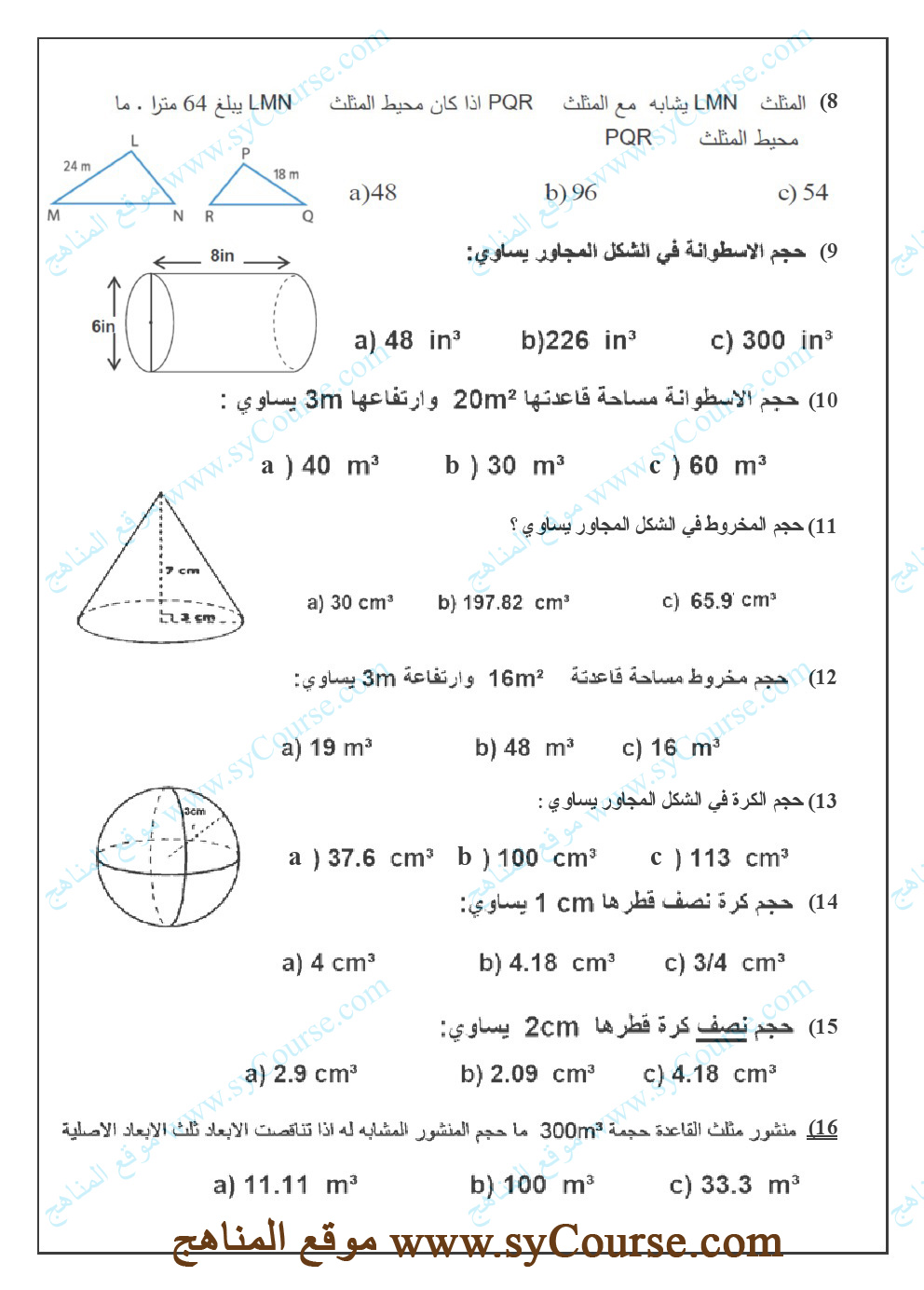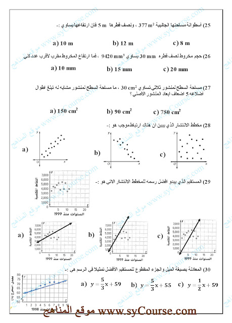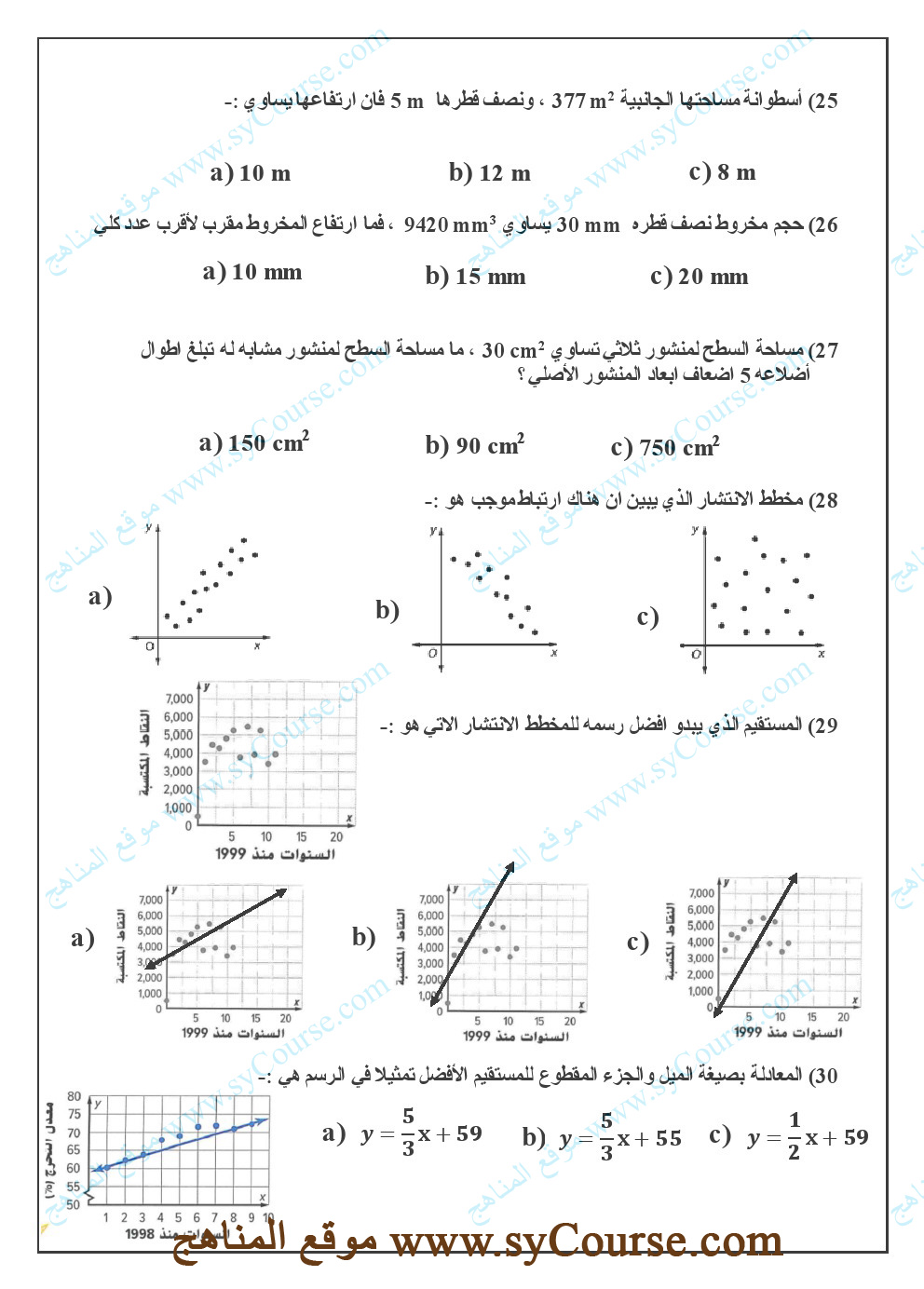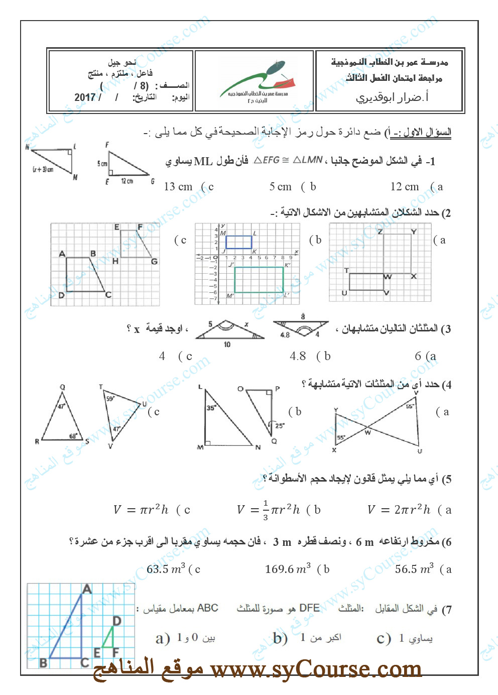 الصف الثامن, الفصل الثالث, رياضيات, أسئلة شاملة للفصل الثالث