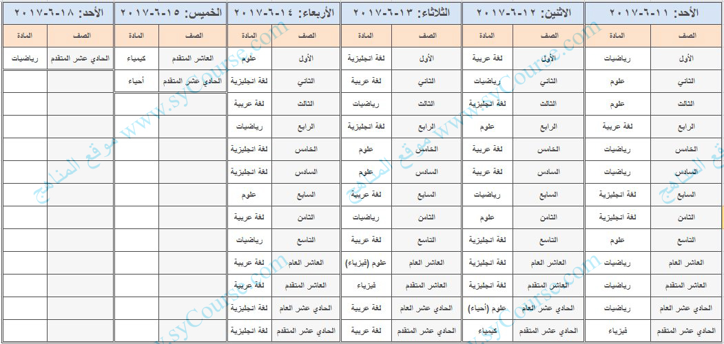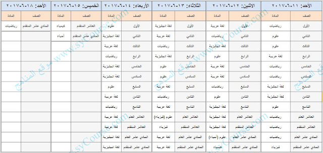 جدول امتحانات نهاية العام الدراسي 2016-2017 يبدأ في 11-6-2017 لجميع الصفوف وينتهي في 18-6-2017 , لرؤية الجدول بالحجم الكامل اضغط على الصورة: | ||