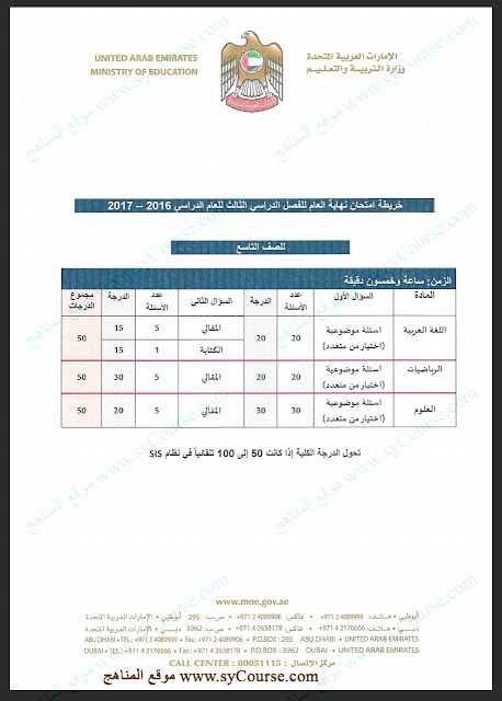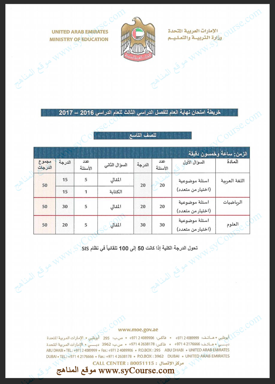 معلومات الملف: الصف التاسع: محتوى خريطة امتحان نهاية العام 2016-2017 التي عممتها الوزارة | ||