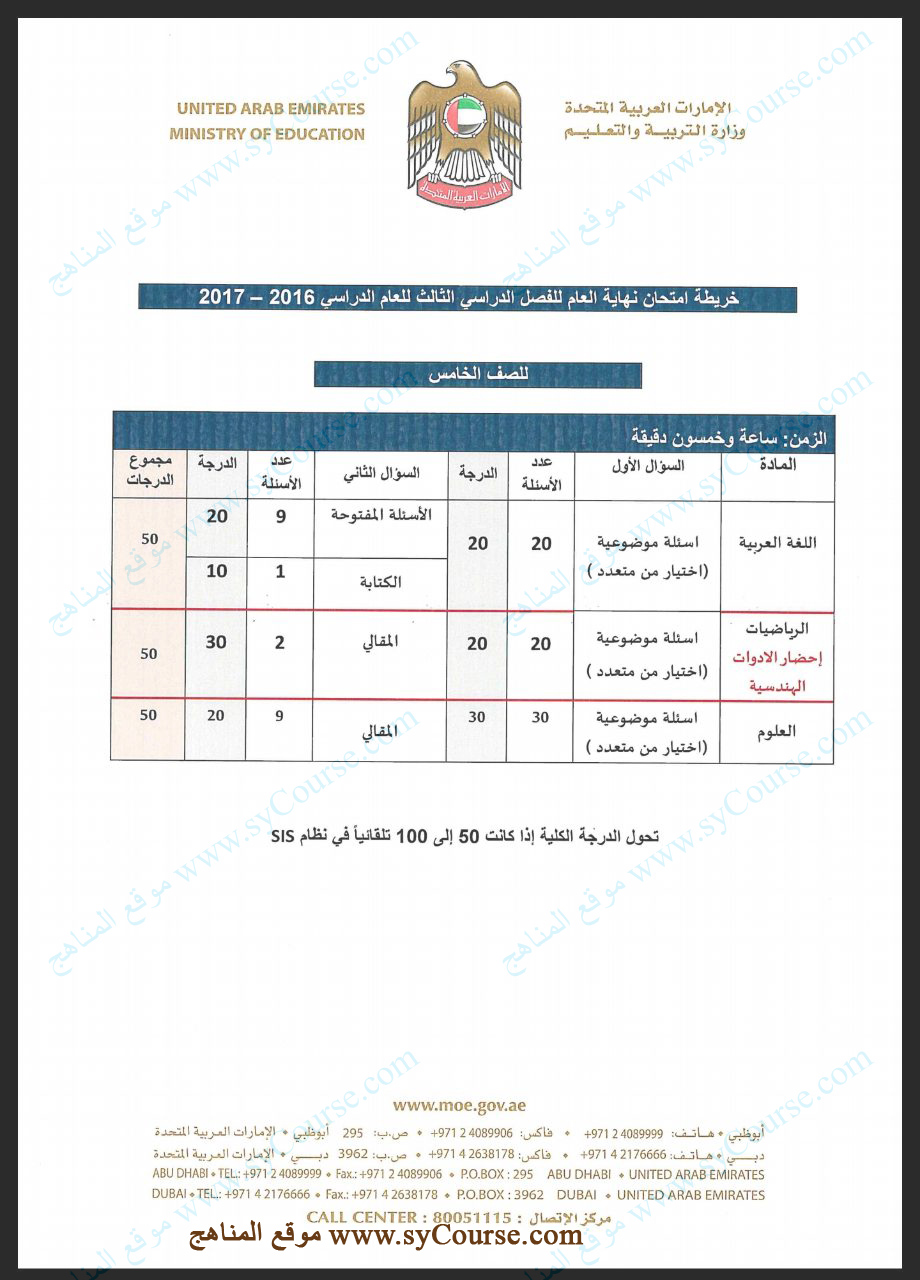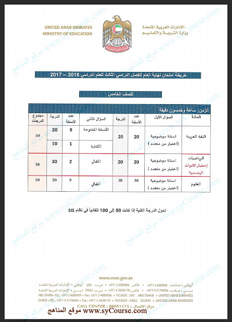 الصف الخامس: محتوى خريطة امتحان نهاية العام 2016-2017 التي عممتها الوزارة |