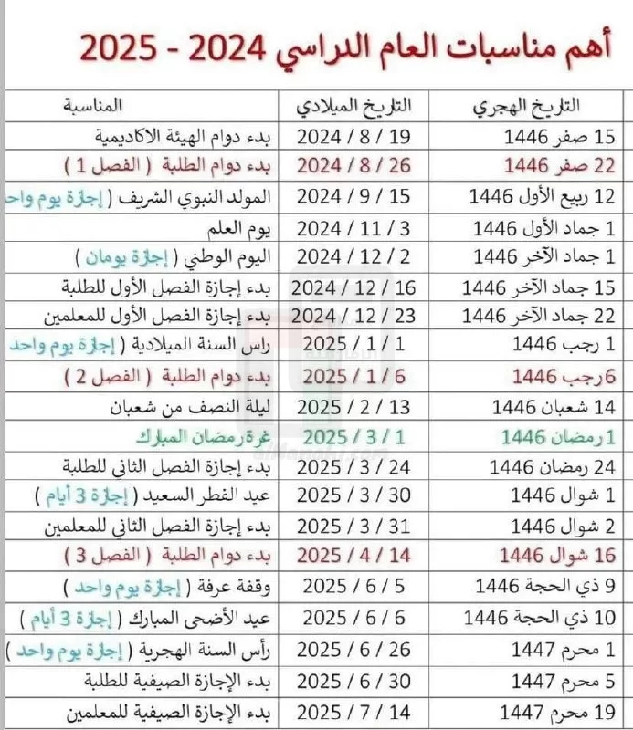 | مواعيد بدء الدراسة والإجازات وأهم المناسبات للعام الدراسي 2024-2025 | ||