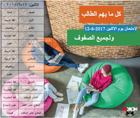 كل ما قد يهم الطالب لامتحان يوم الاثنين (1262017) لجميع الصفوف (مواضيع متجددة إلى لحظة الامتحان) | ||