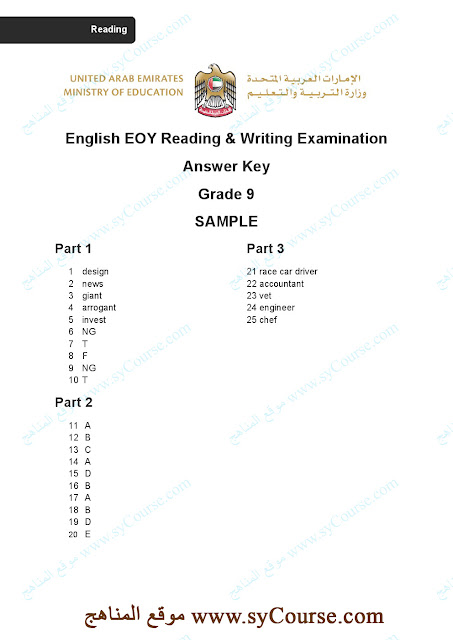 الصف التاسع, لغة انكليزية, نموذج الاجابة لامتحان نهاية العام الدراسي 2016-2017