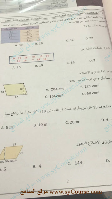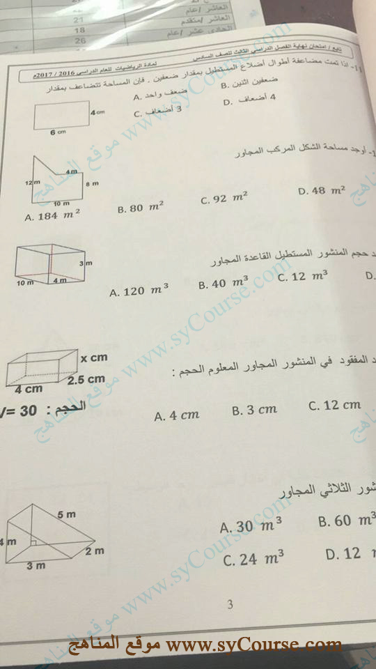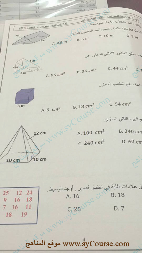 الصف السادس, رياضيات, أسئلة الامتحان الوزاري لنهاية العام الدراسي 2016-2017