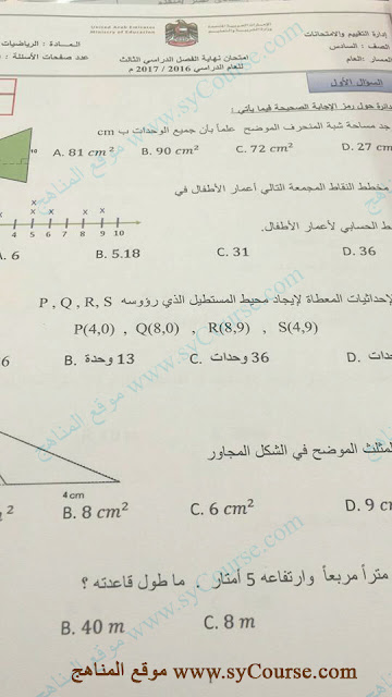 أسئلة الامتحان الوزاري لنهاية, الصف السادس, رياضيات, الفصل الأول, 2016-2017 - المناهج الإماراتية