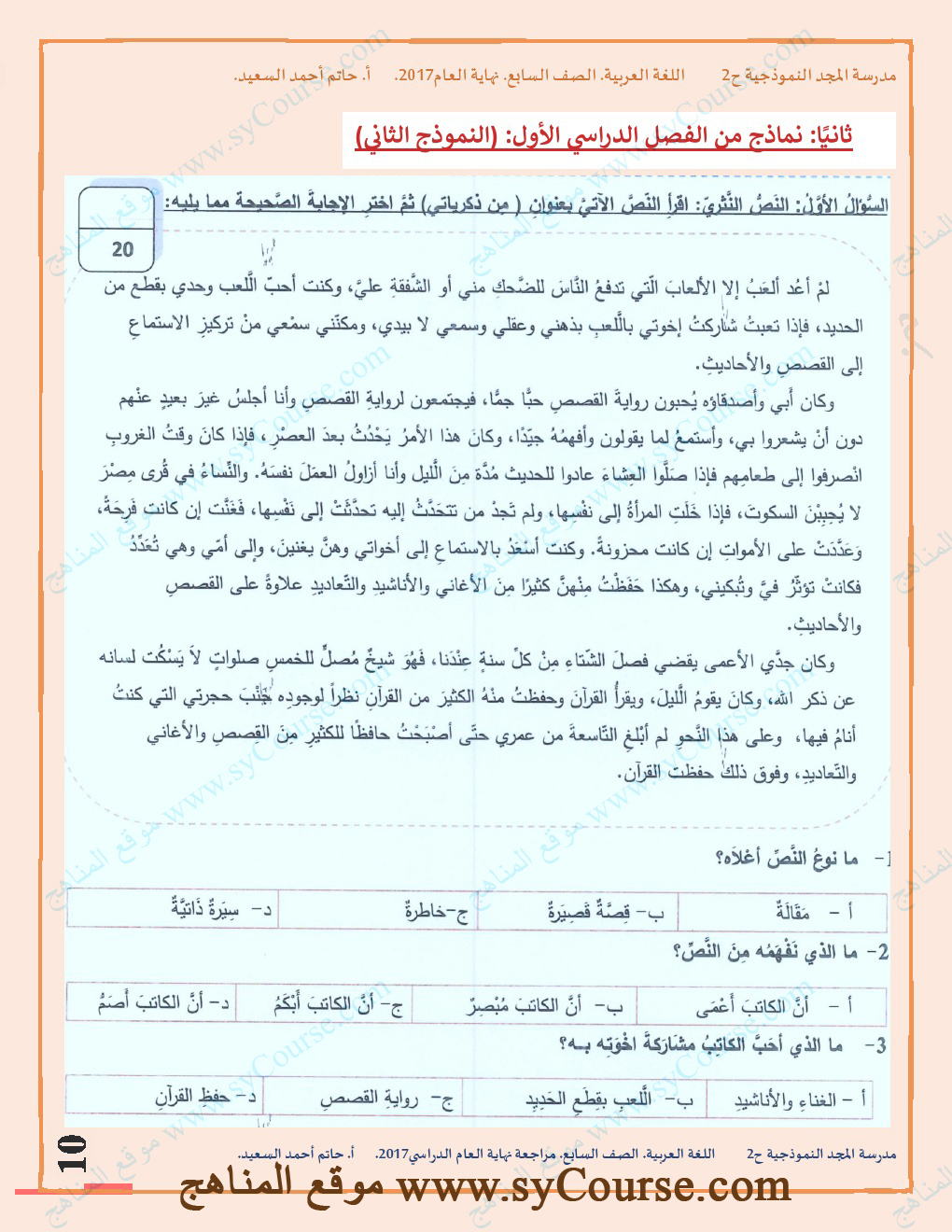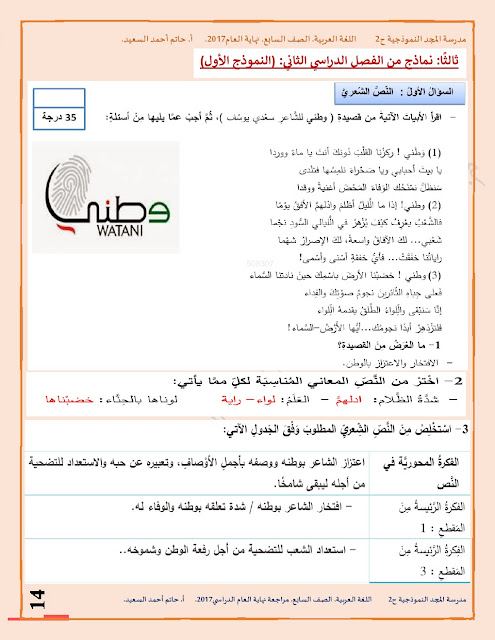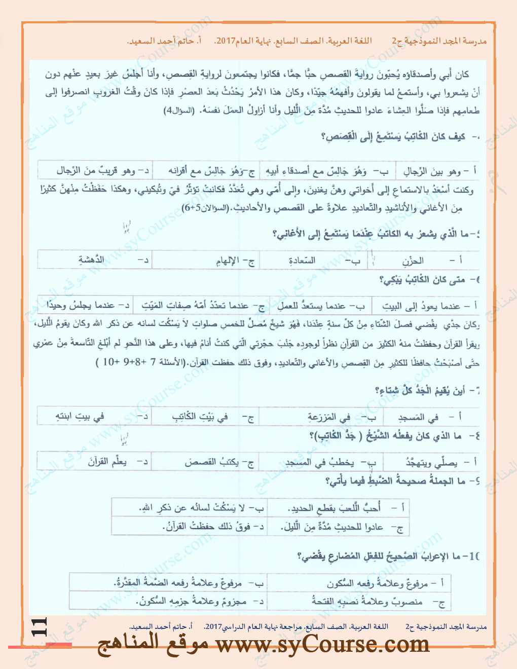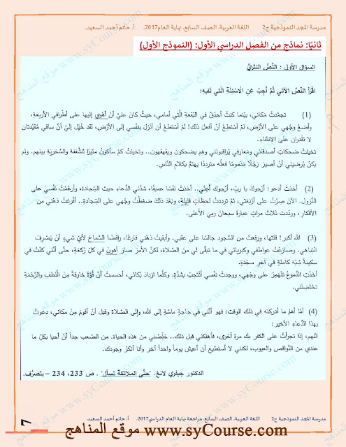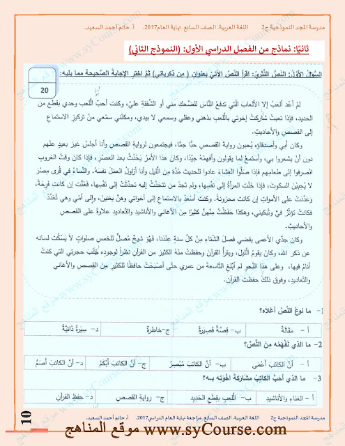 | الصف السابع, لغة عربية, مراجعة شاملة لامتحان نهاية العام الدراسي 2016-2017 للتحميل اتبع الرابط التالي: http://sycourse.com/up/do.php?id=426