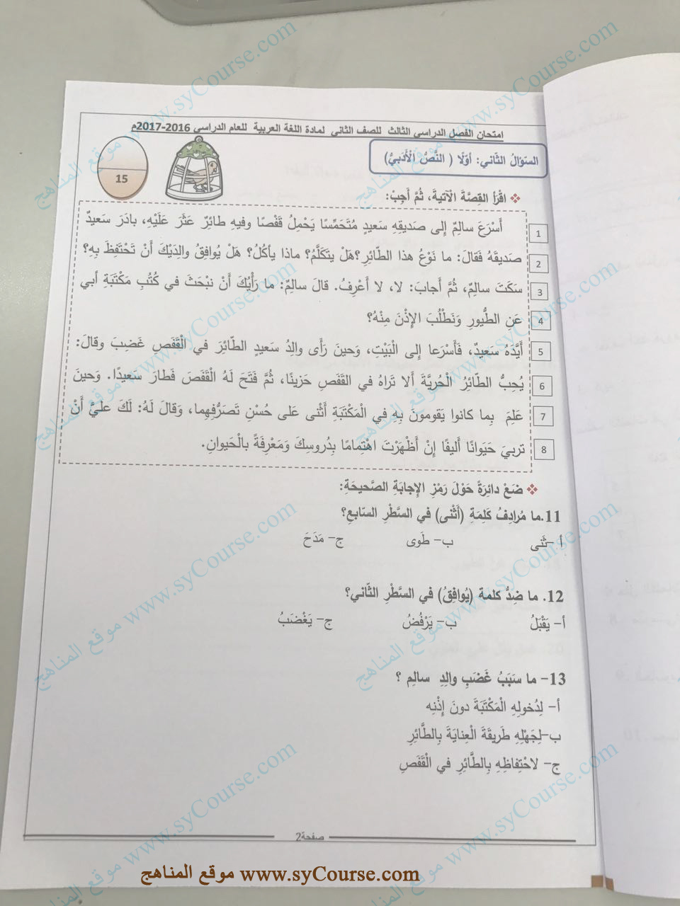 الصف الثاني, لغة عربية, أسئلة امتحان نهاية العام الدراسي 2016-2017 للتحميل اتبع الرابط التالي: http://sycourse.com/up/do.php?id=433