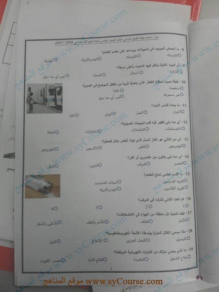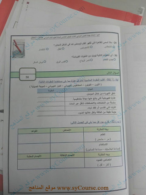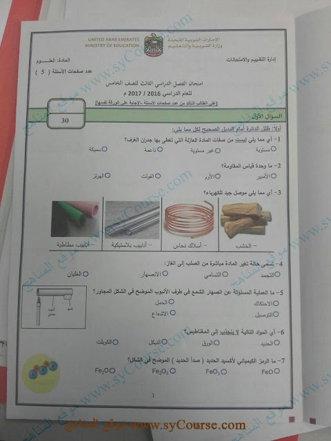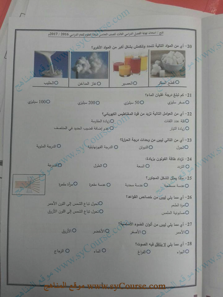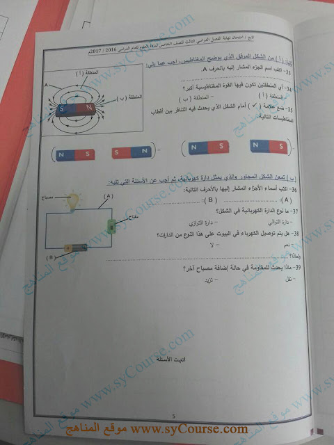 الصف الخامس, علوم, اسئلة امتحان نهاية العام الدراسي 2016-2017 للتحميل اتبع الرابط التالي: http://sycourse.com/up/do.php?id=435