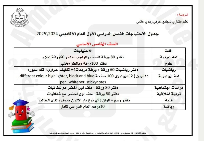 معلومات الملف: نرفق لكم ملف يتضمن جدول احتياجات المواد من دفاتر وألوان الحلقة الثانية (الصفوف من الخامس حتى الثامن) في مدرسة الروابي الخاصة الفصل الدراسي الأول للعام الدراسي 2024-2025 | ||