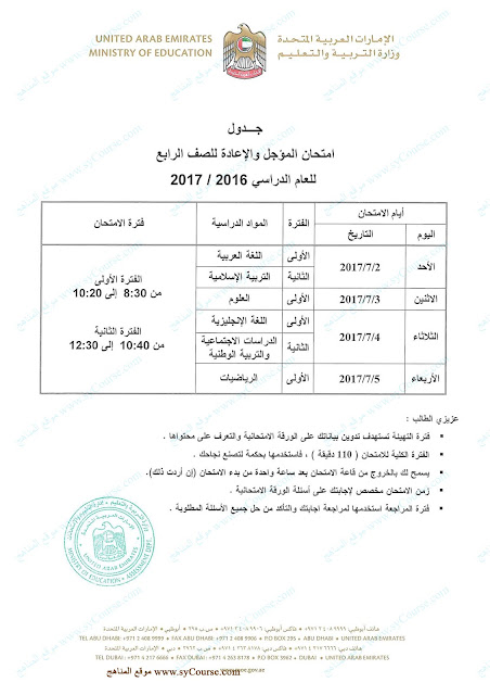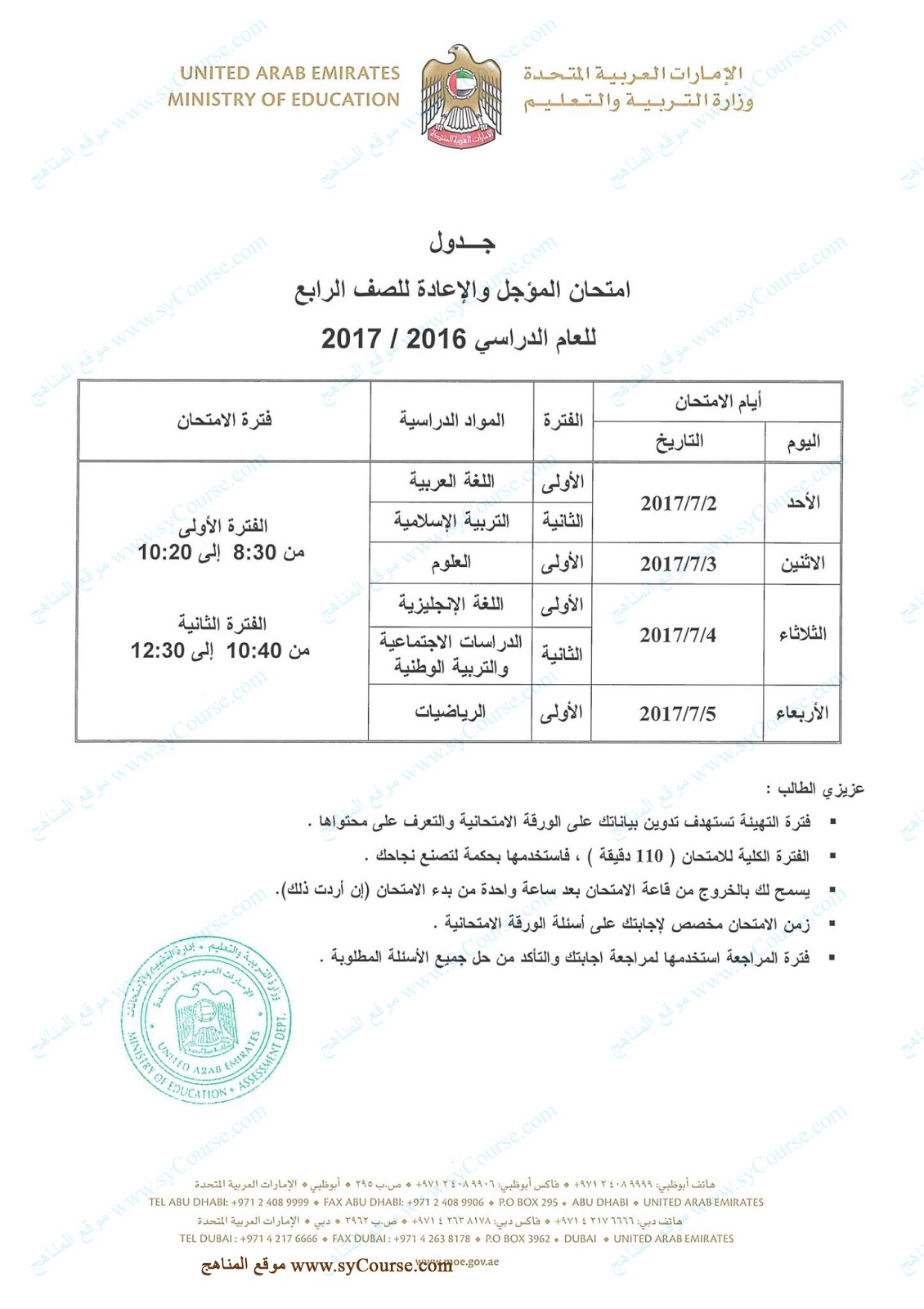 جدول امتحان المؤجل والإعادة للصف الرابع للعام الدراسي 2016-2017
