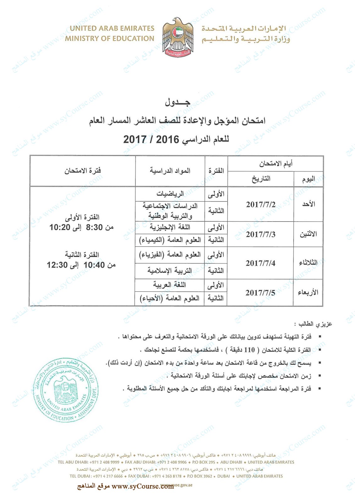 معلومات الملف: جدول امتحان المؤجل والإعادة للصف العاشر العام والمتقدم للعام الدراسي 2016-2017 | ||