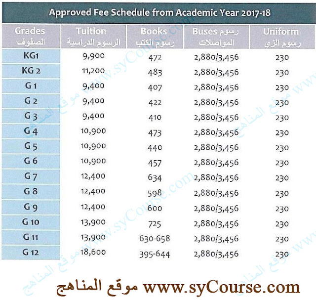 الرسوم الدراسية الجديدة للصفوف من KG1 وحتى الثاني عشر 2017-2018 | ||