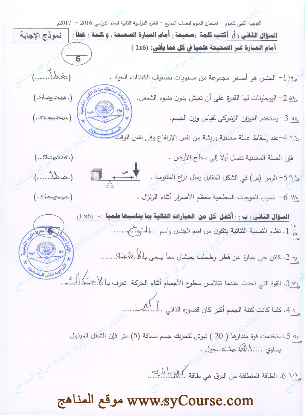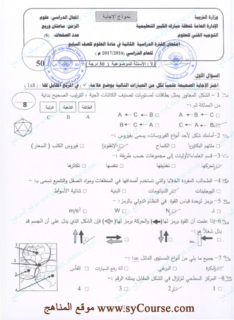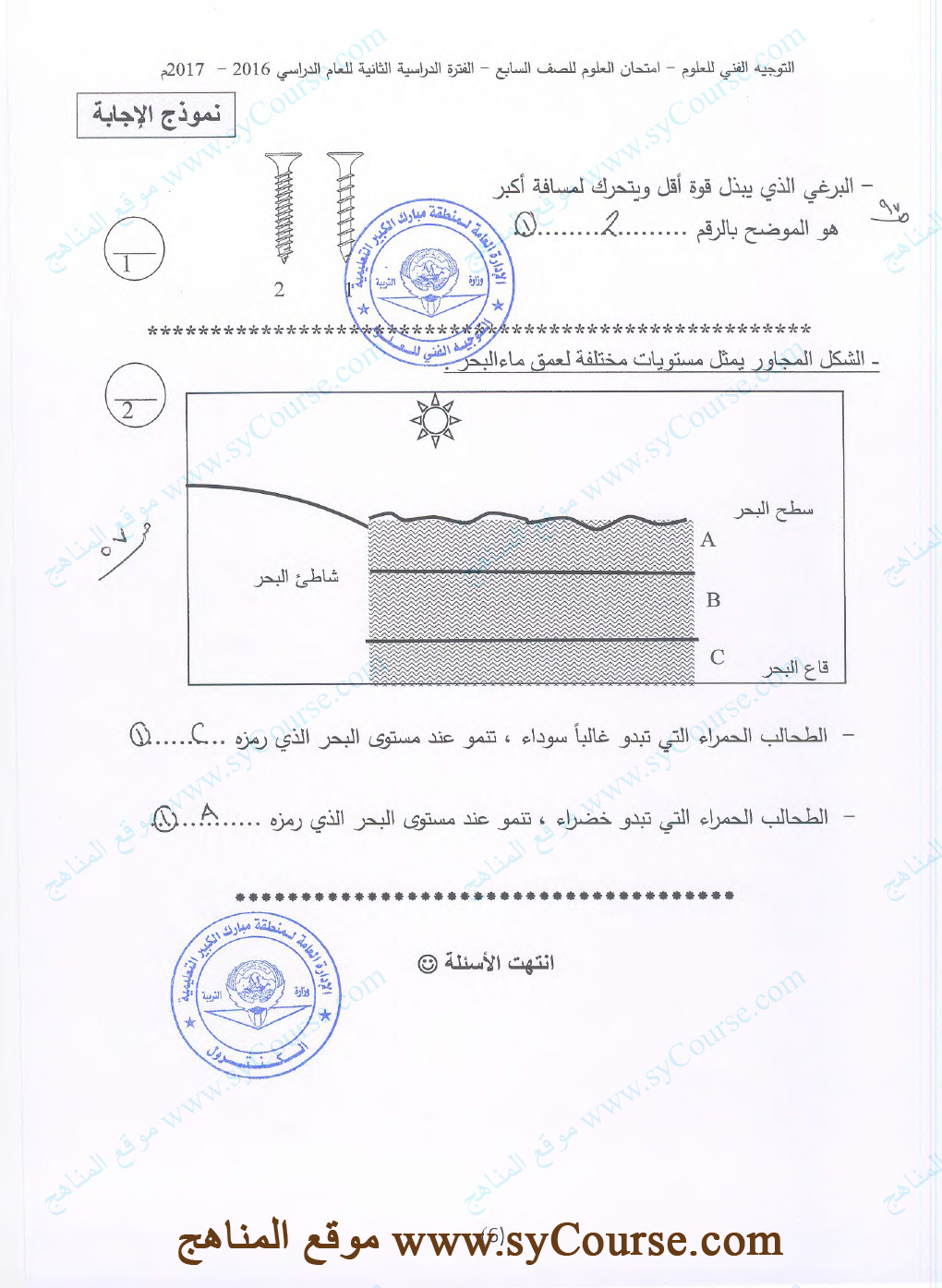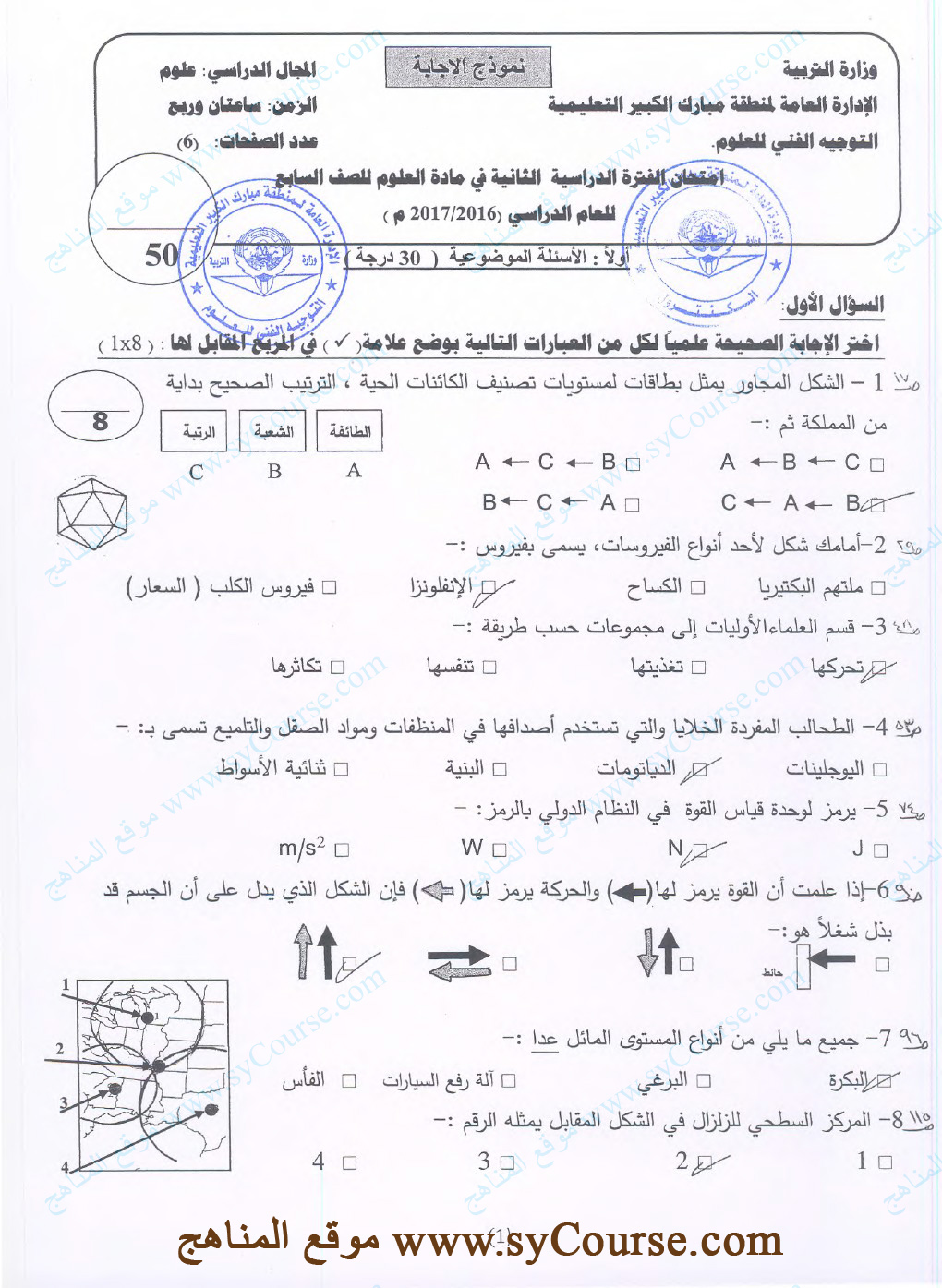 معلومات الملف: الصف السابع, الفصل الثاني, علوم, اختبار نهاية الفصل الثاني من العام الدراسي 2016-2017 مع الإجابة | ||