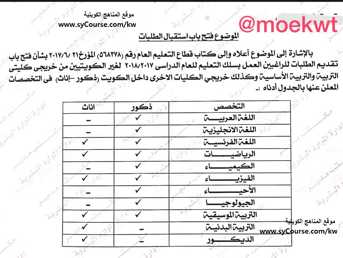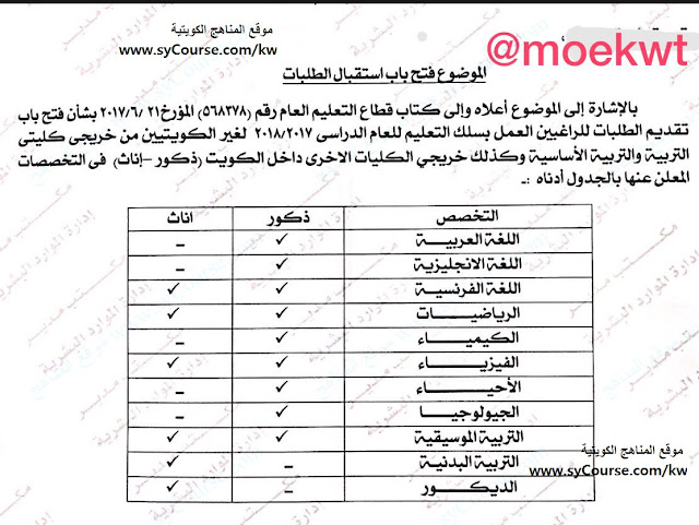 أعلنت وزارة التربية والتعليم في الكويت عبر صفحتها على تويتر عن فتح باب تقديم الطلبات للراغبين بالعمل في سلك التعليم العام للعام الدراسي 2017-2018 لغير الكويتيين: وحددت الاختصاصات المطلوبة, كما هو موضح في الصورة أدناه: