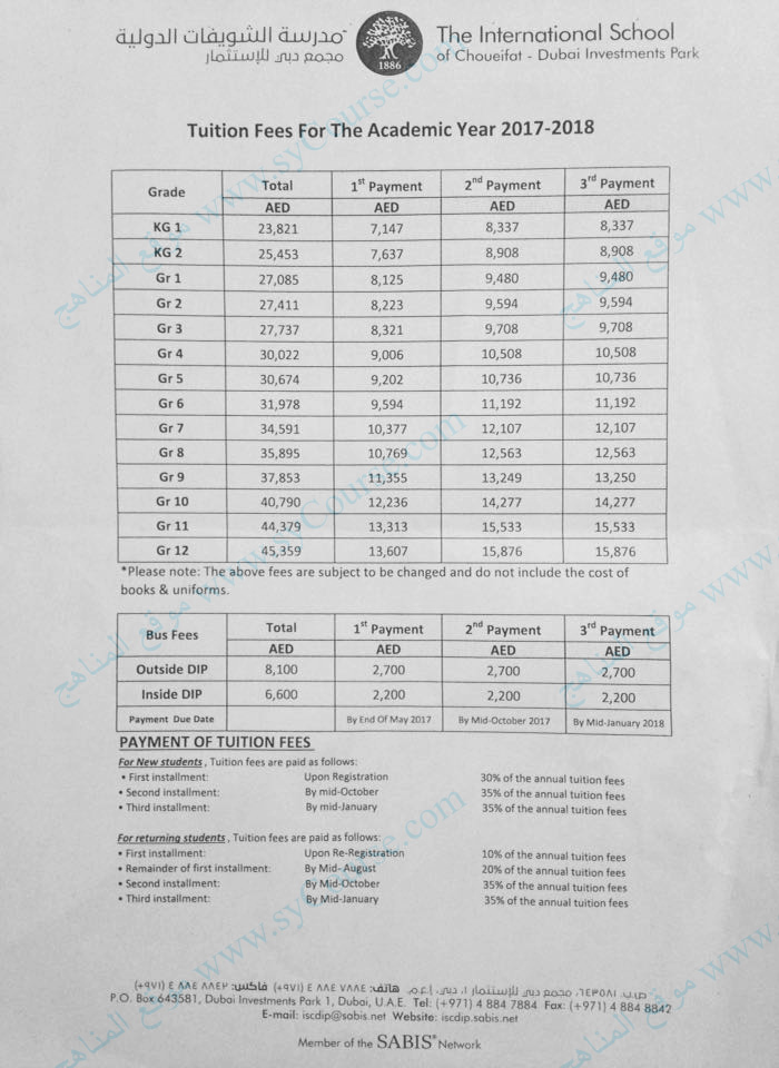 أقساط السنة القادمة لجميع المراحل ( خاص بفرع دبي DIP):2017-2018 للصفوف من الأول وحتى الثاني عشر تبدأ بـ 8000 درهم وتنتهي بـ 16 الف بدون الباص