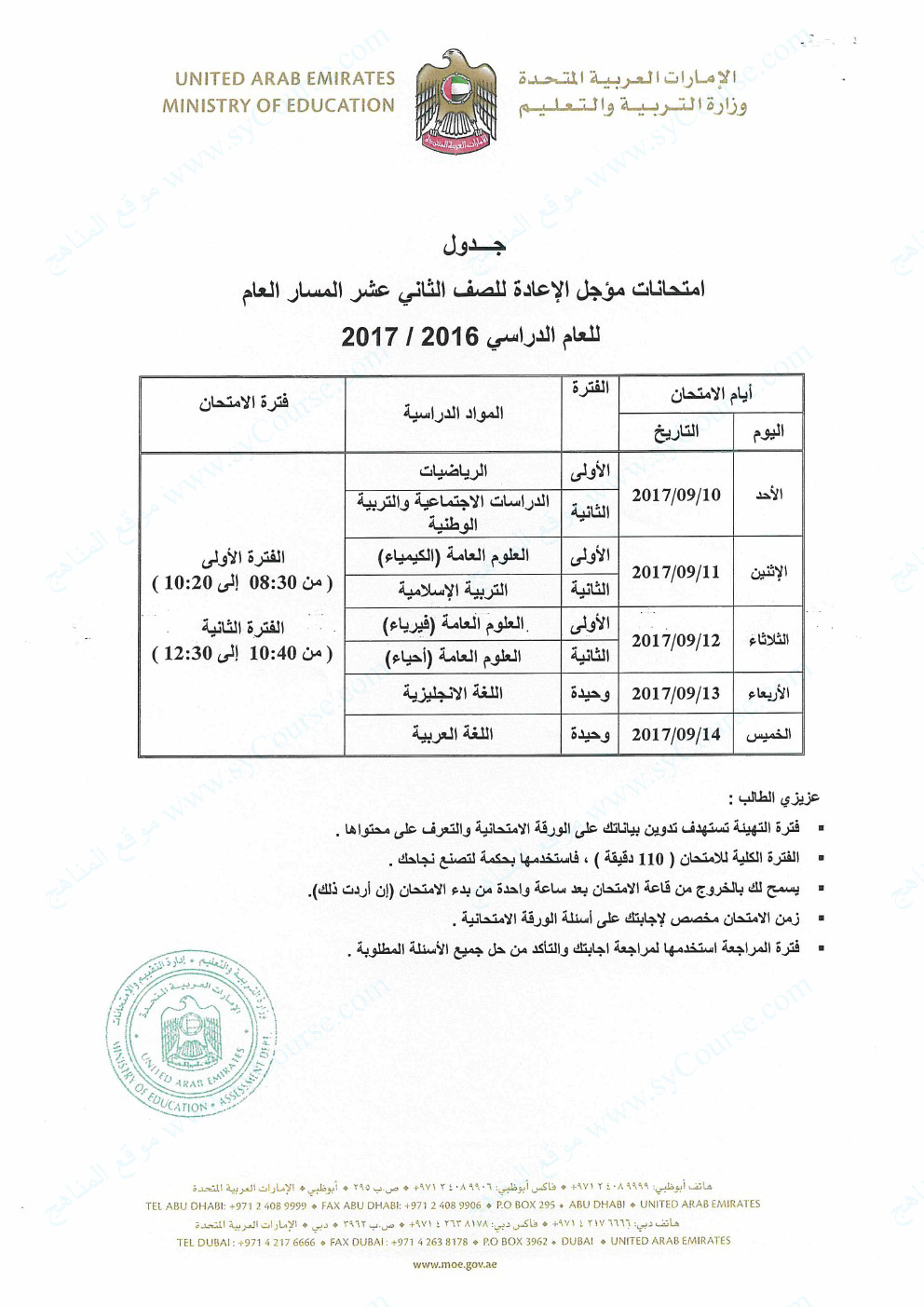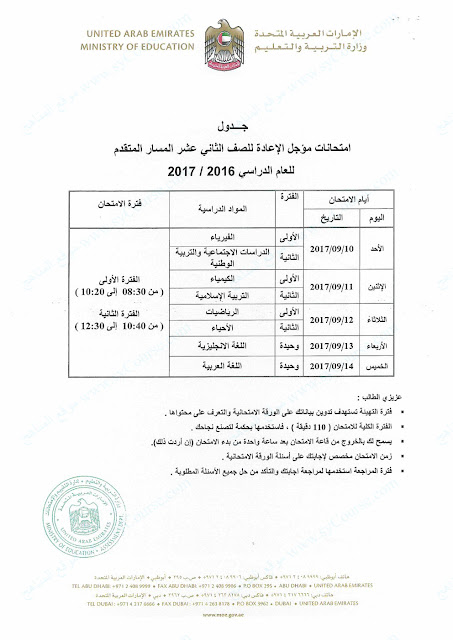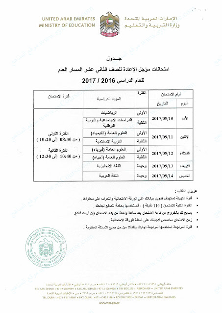 جدول امتحانات مؤجل الإعادة للصف الثاني عشر العام والمتقدم للعام الدراسي 2016-2017 حيث يبدأ الامتحان في يوم الأحد الموافق لـ 10-9-2017 وينتهي في يوم الخميس الموافق لـ 14-9-2017