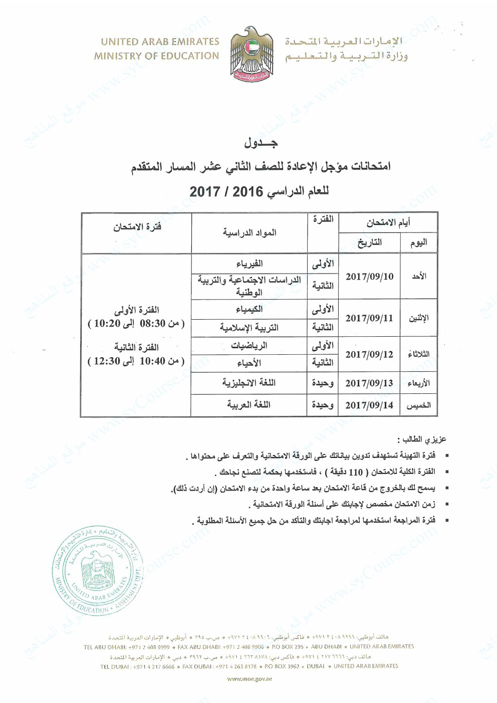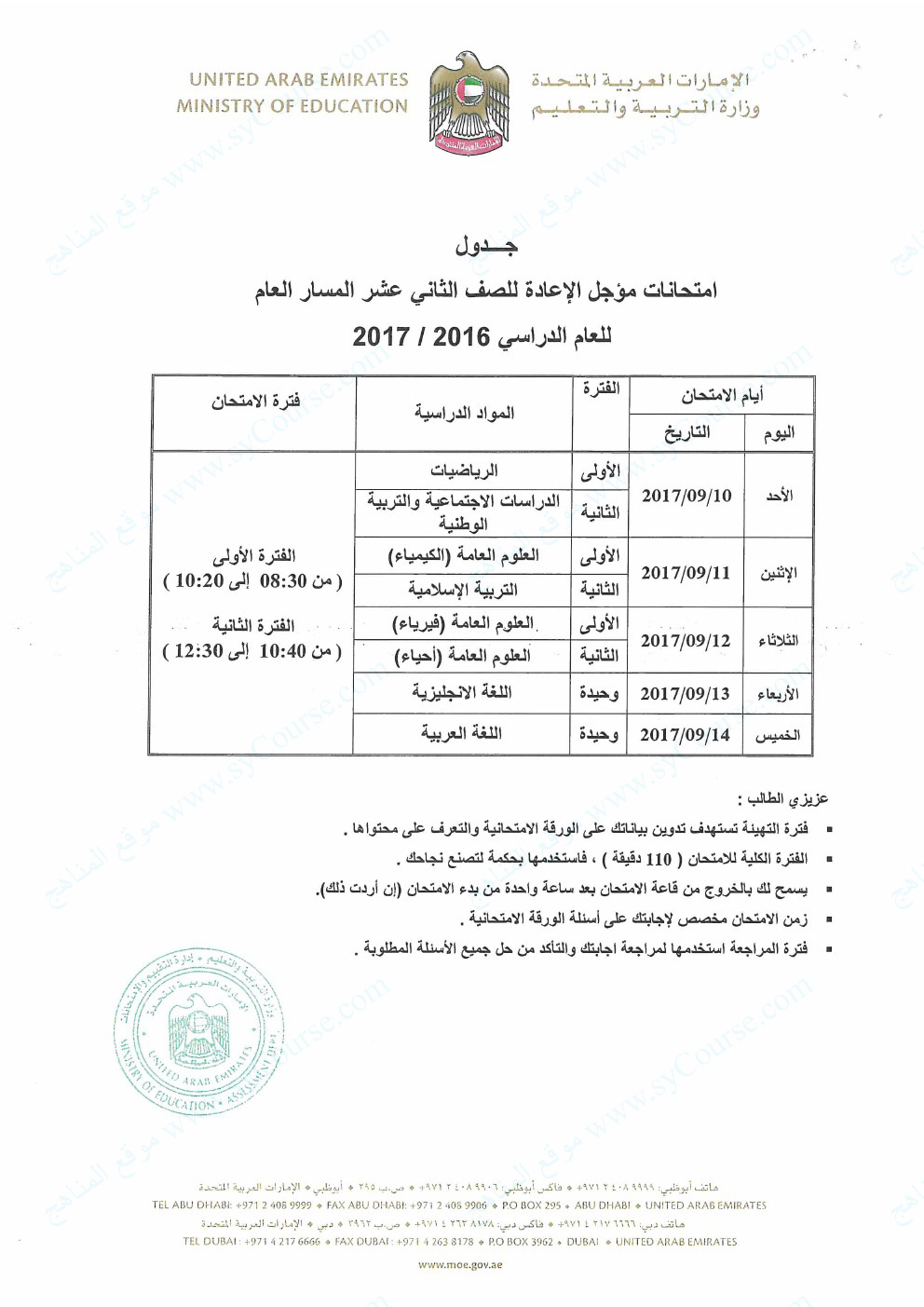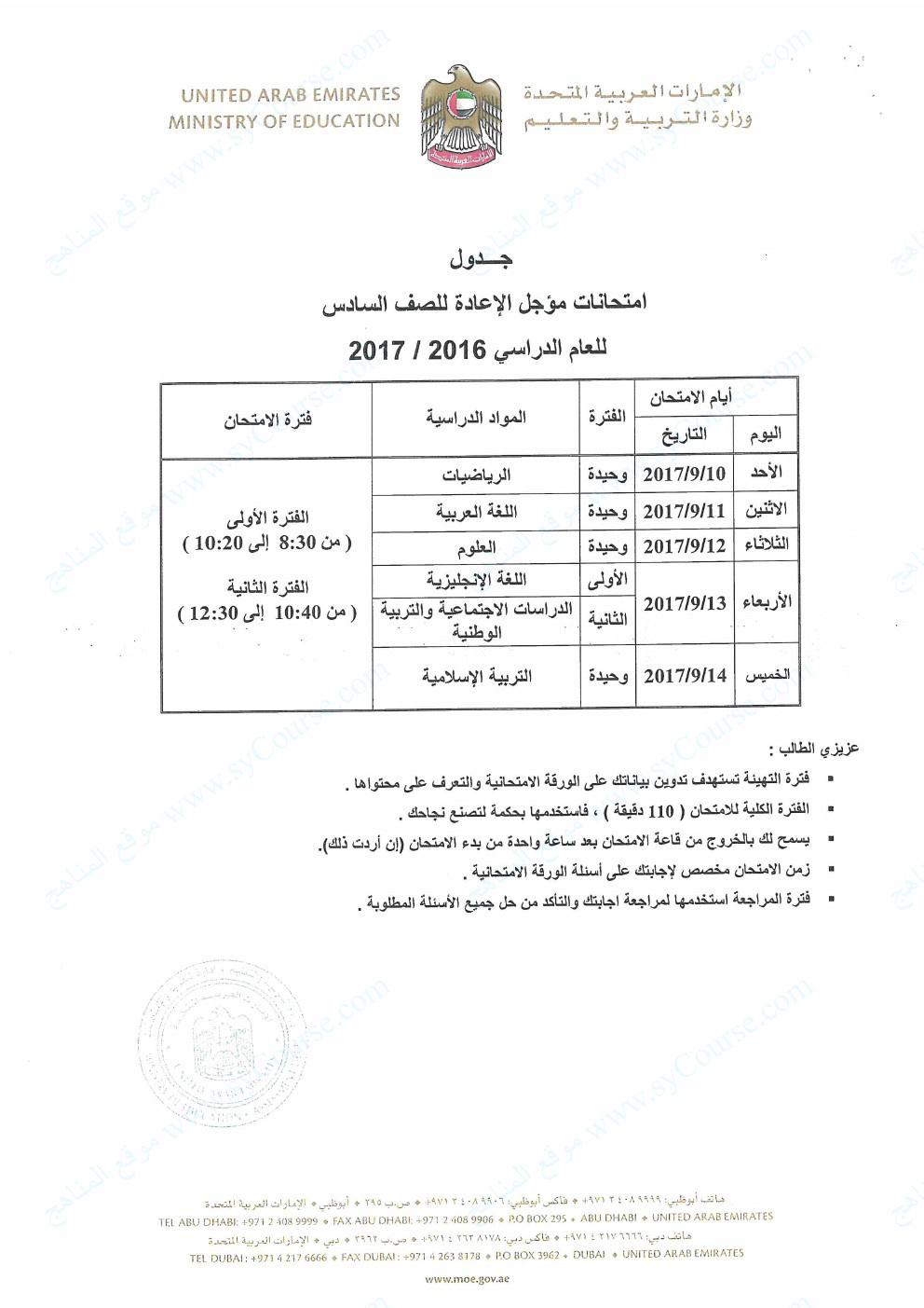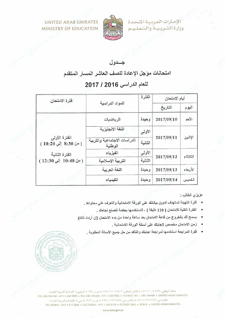جدول امتحانات مؤجل الإعادة للصفوف من الثالث وحتى الثاني عشر 2016-22017 | ||