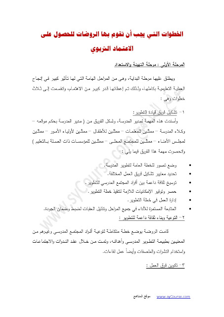 هناك عدة مراحل يجب على أصحاب الروضات أخذها بعين الاعتبار عند التقدم للحصول على الاعتماد اللازم لروضاتهم وهي: المرحلة الأولى : مرحلة التهيئة والاستعدادويطلق عليها مرحلة البداية، وهى من المراحل الهامة التي لها تأثير كبير في إنجاح العملية التعليمية بكاملها، ولذلك تم إعطائها قدر كبير من الاهتمام، وانقسمت إلى ثلاث خطوات وهى : 1- تشكيل فريق قيادة التطوير. 2- التوعية وبناء ثقافة داعمة للتطوير. 3- تكوين فرق العمل. وإليكم رابطاً يحوي الملف بشكل كامل: http://sycourse.com/up/do.php?id=445