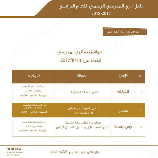 نشرت وزارة التربية والتعليم على صفحات التواصل الاجتماعي التابعة لها أماكن بيع الزي المدرسي الخاص بالعام الدراسي 2017-2018 في جميع الإمارات والمناطق التالية: الشارقة, عجمان, رأس الخيمة, دبي, أم القيوين , الفجيرة, كلباء, الشرقية (خورفكان) حيث يبدأ في 13 أغسطس من عام 2017