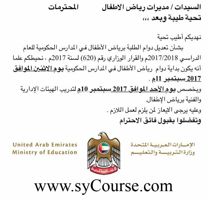 | أحدث تعديل على دوام طلبة رياض الأطفال: يبدأ الدوام في 11 سبتمبر 2017 | ||