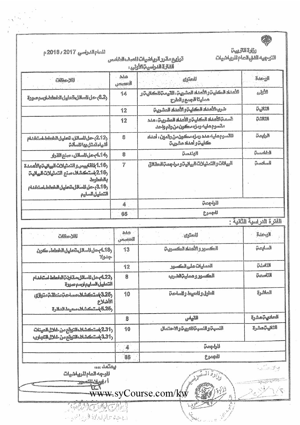 | إليكم توزيع مادة الرياضيات وفق المنهاج الكويتي للفترتين الدراسيتين الأولى والثانية من العام الدراسي 2017-2018 | ||