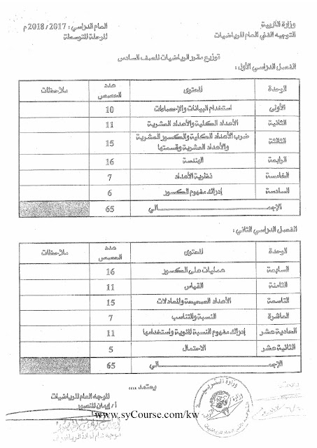 إليكم توزيع مادة الرياضيات وفق المنهاج الكويتي للفترتين الدراسيتين الأولى والثانية من العام الدراسي 2017-2018 |