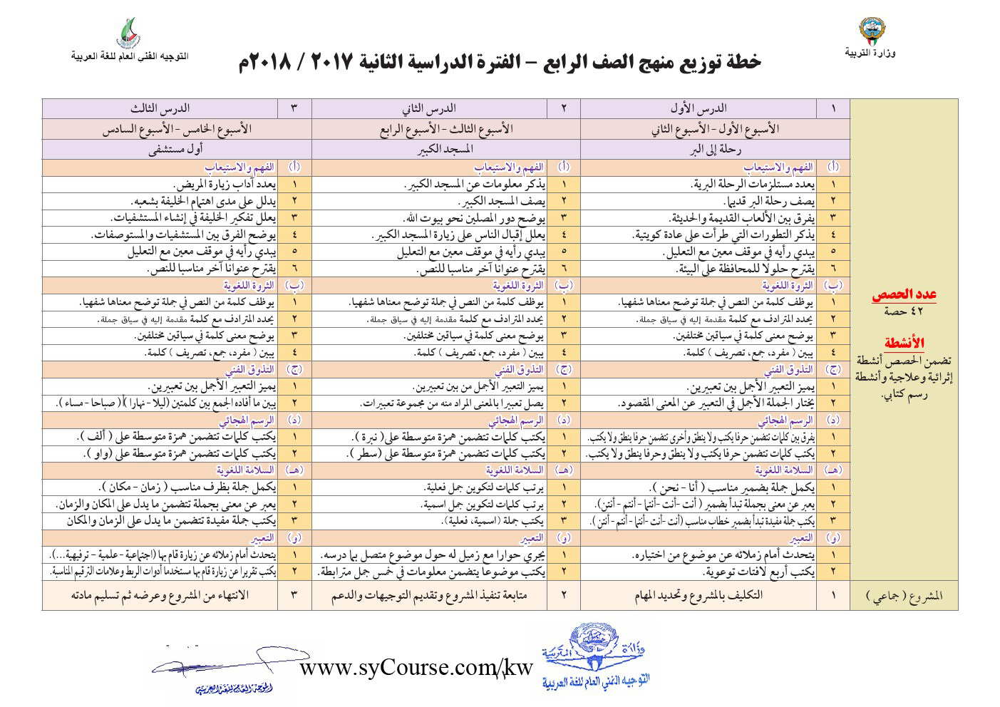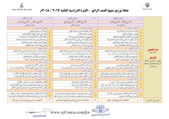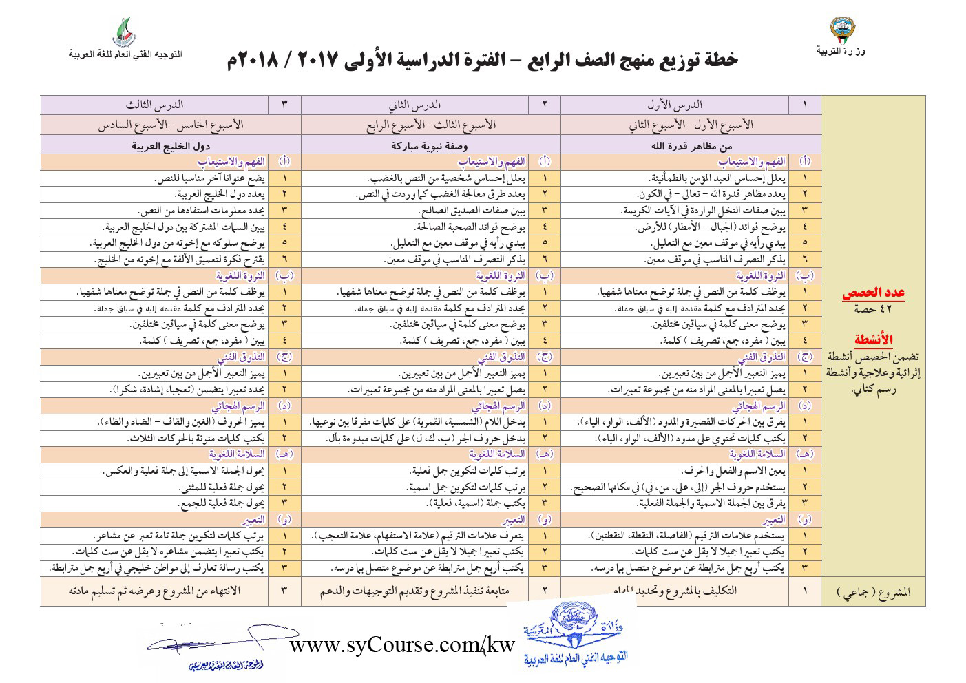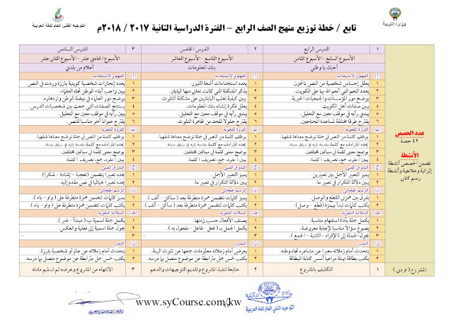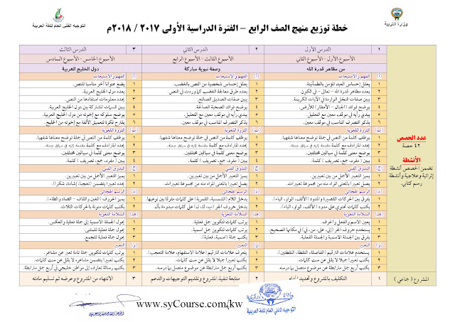 إليكم خطة توزيع منهاج اللغة العربية وفق دولة الكويت للعام الدراسي 2017-2017 ووفق الصف المحدد أعلاه للفصل الدراسي الأول والثاني