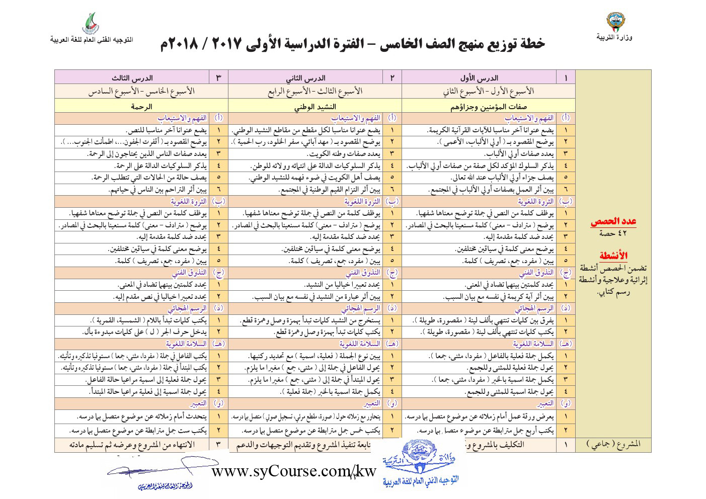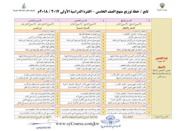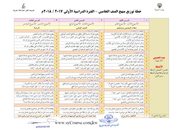إليكم خطة توزيع منهاج اللغة العربية وفق دولة الكويت للعام الدراسي 2017-2017 ووفق الصف المحدد أعلاه |