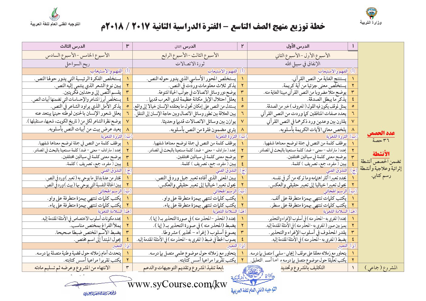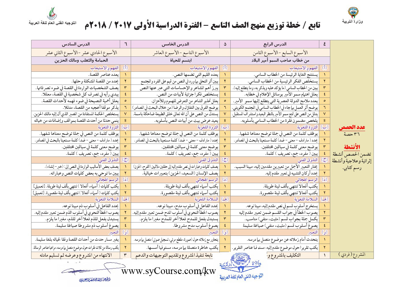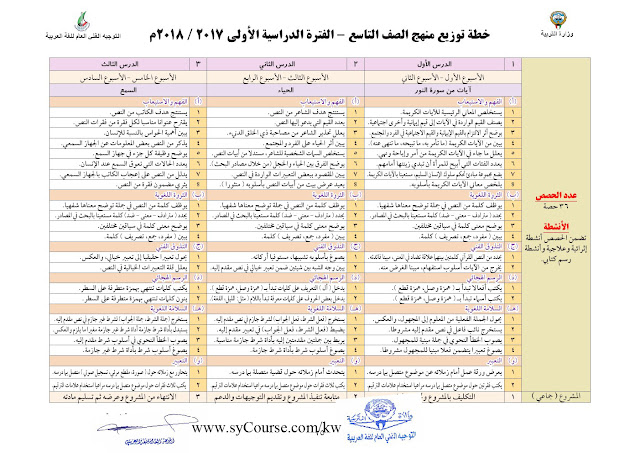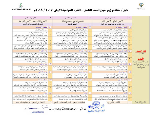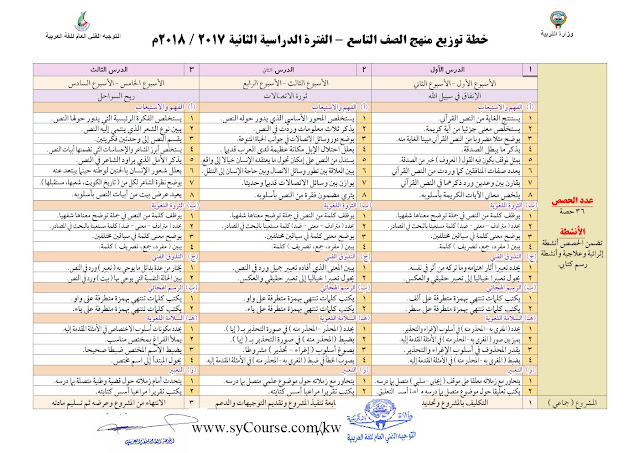 إليكم خطة توزيع منهاج اللغة العربية وفق دولة الكويت للعام الدراسي 2017-2017 ووفق الصف المحدد أعلاه | ||