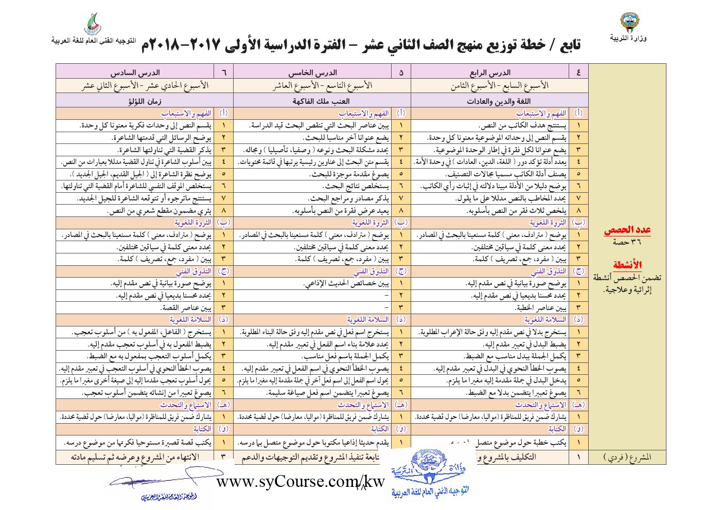 إليكم خطة توزيع منهاج اللغة العربية وفق دولة الكويت للعام الدراسي 2017-2017 ووفق الصف المحدد أعلاه | ||