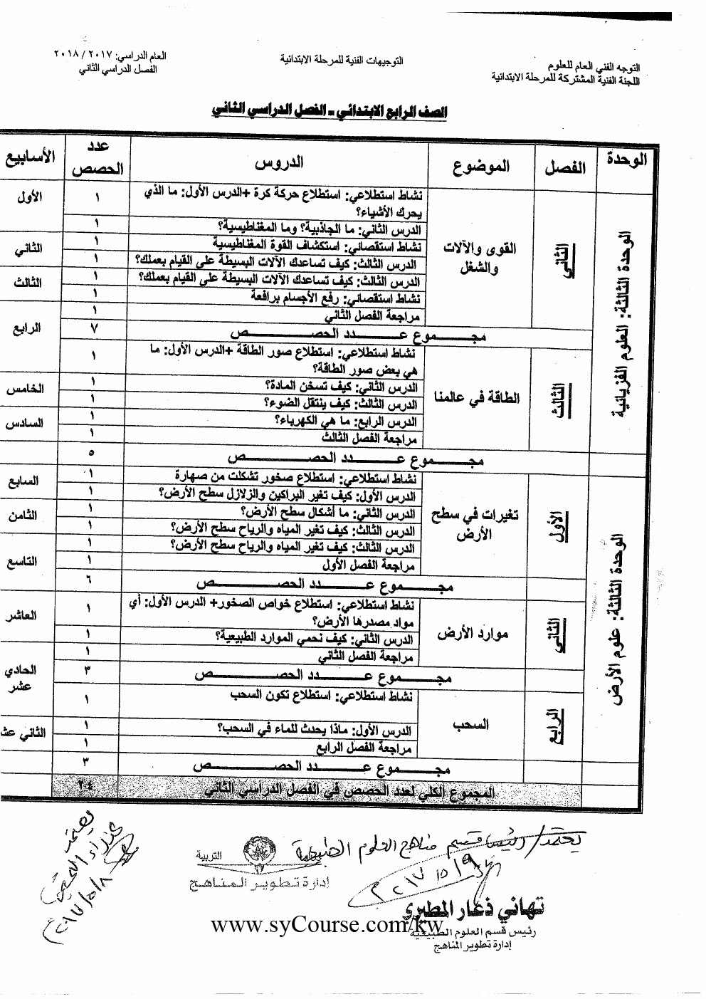 إليكم توزيع المنهج في مادة العلوم للصف المحدد أعلاه للعام الدراسي 2017-2018 وذلك وفق المنهاج الكويتي | ||