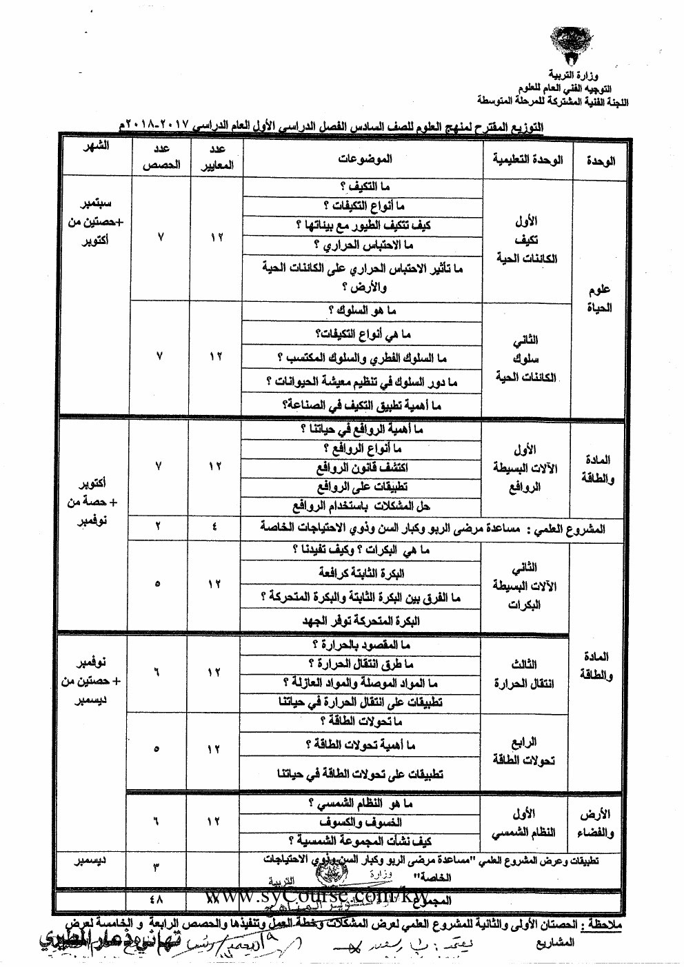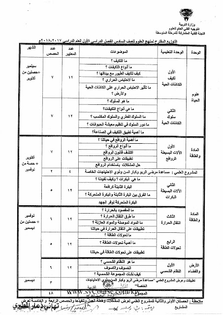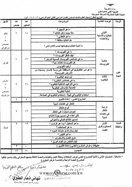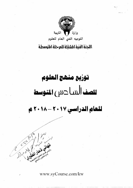 إليكم توزيع المنهج في مادة العلوم للصف المحدد أعلاه للعام الدراسي 2017-2018 وذلك وفق المنهاج الكويتي |
