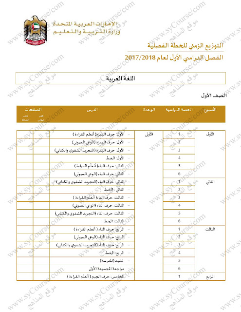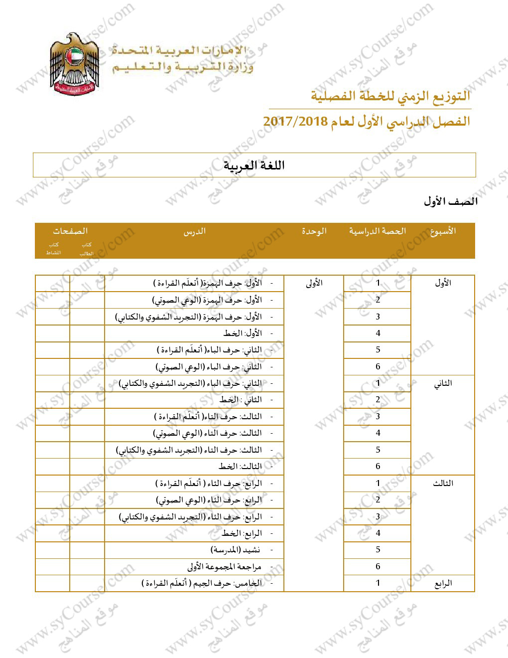 معلومات الملف: الصف الأول, الفصل الأول, لغة عربية, التوزيع الزمني للخطة الفصلية 2018-2017 | |||