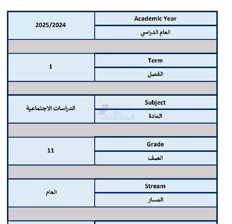 معلومات الملف: نرفق لكم ملف الذي يتضمن الهيكل الوزاري الجديد كافة المسارات من مادة الدراسات الاجتماعية للصف الحادي عشر الفصل الدراسي الأول للعام الدراسي 2024ف-2025 | ||