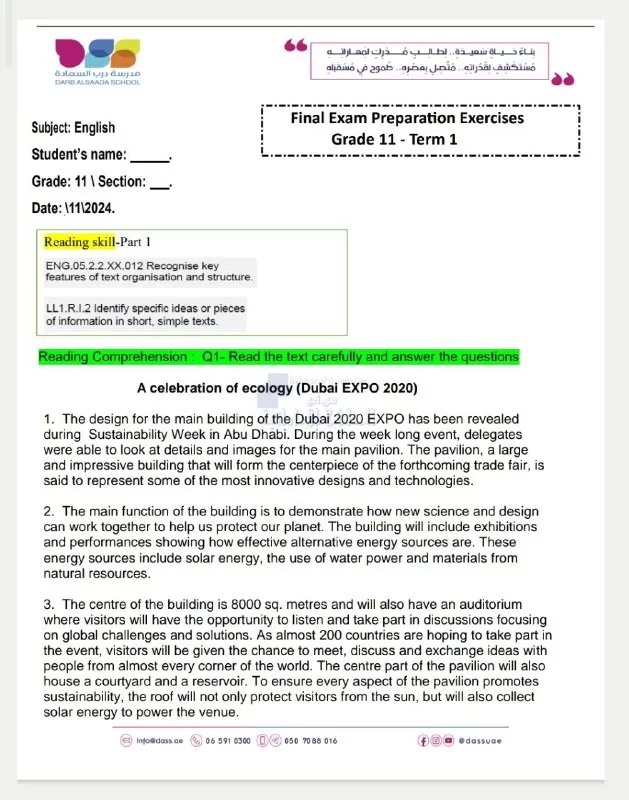 معلومات الملف: نرفق لكم ملف يتضمن الكراسة التدريبية للاختبار النهائي وفق الهيكل الوزاري مع حل من مادة اللغة الانجليزية للصف الحادي عشر المتقدم الفصل الدراسي الأول للعام الدراسي 2024-2025 | ||