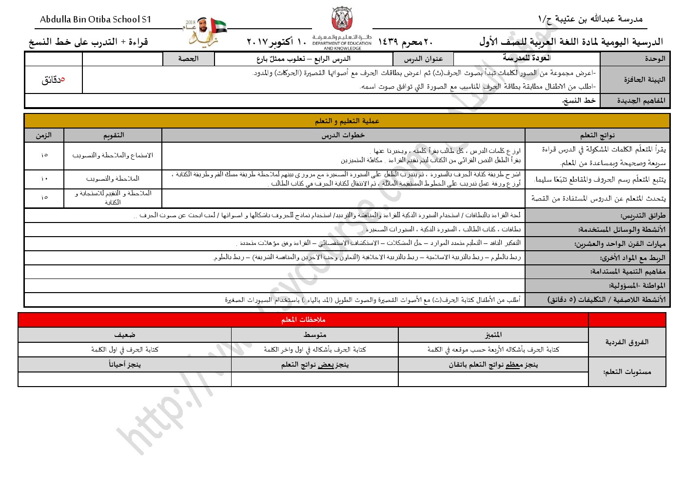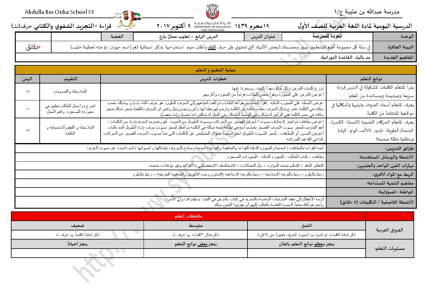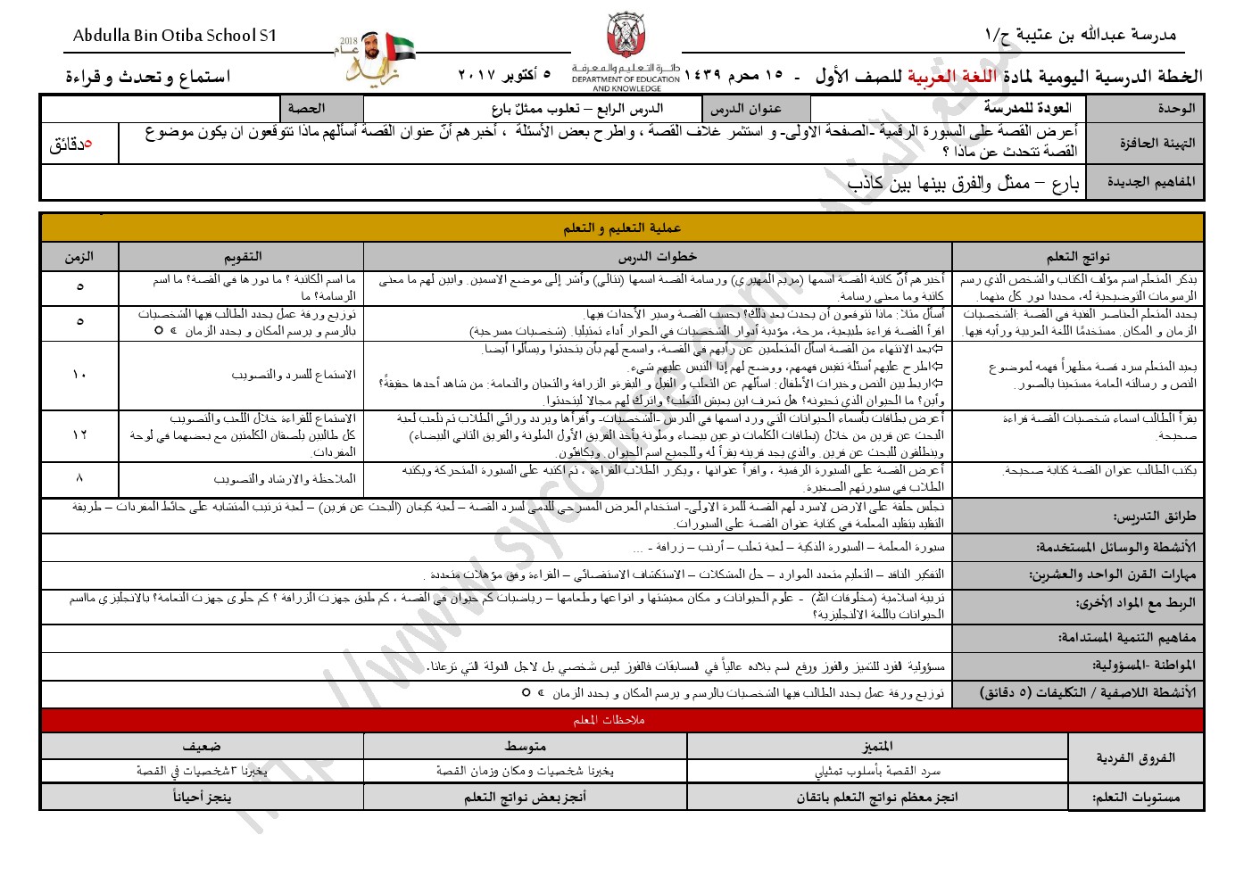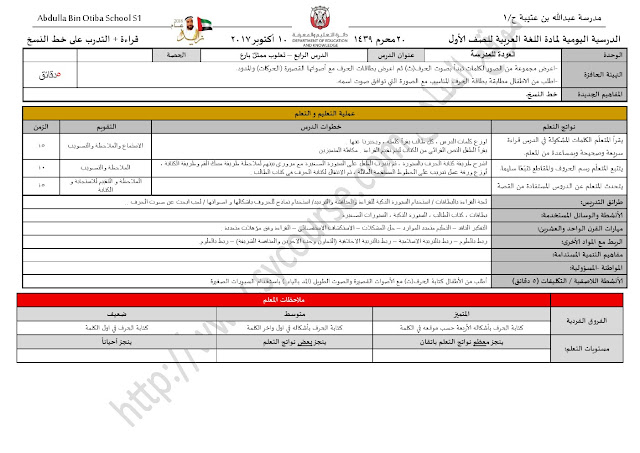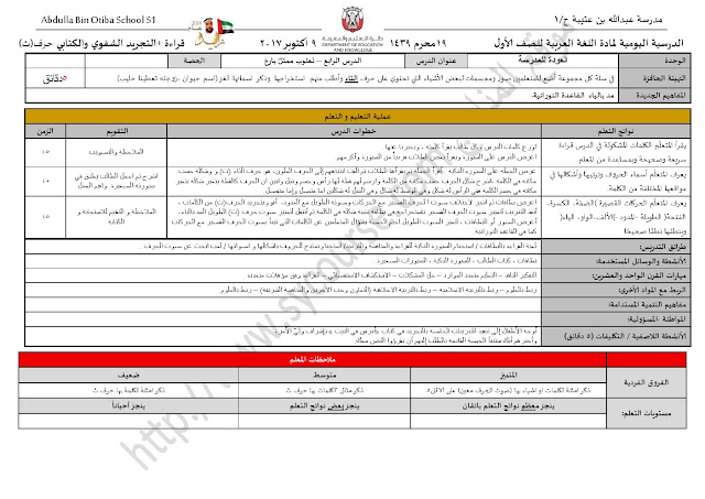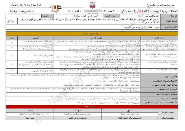 معلومات الملف: الصف الأول, الفصل الأول, لغة عربية, 2017-2018,نموذجتحضير الخطة الدرسية اليومية -استماع وتحدث وقراءة | |||